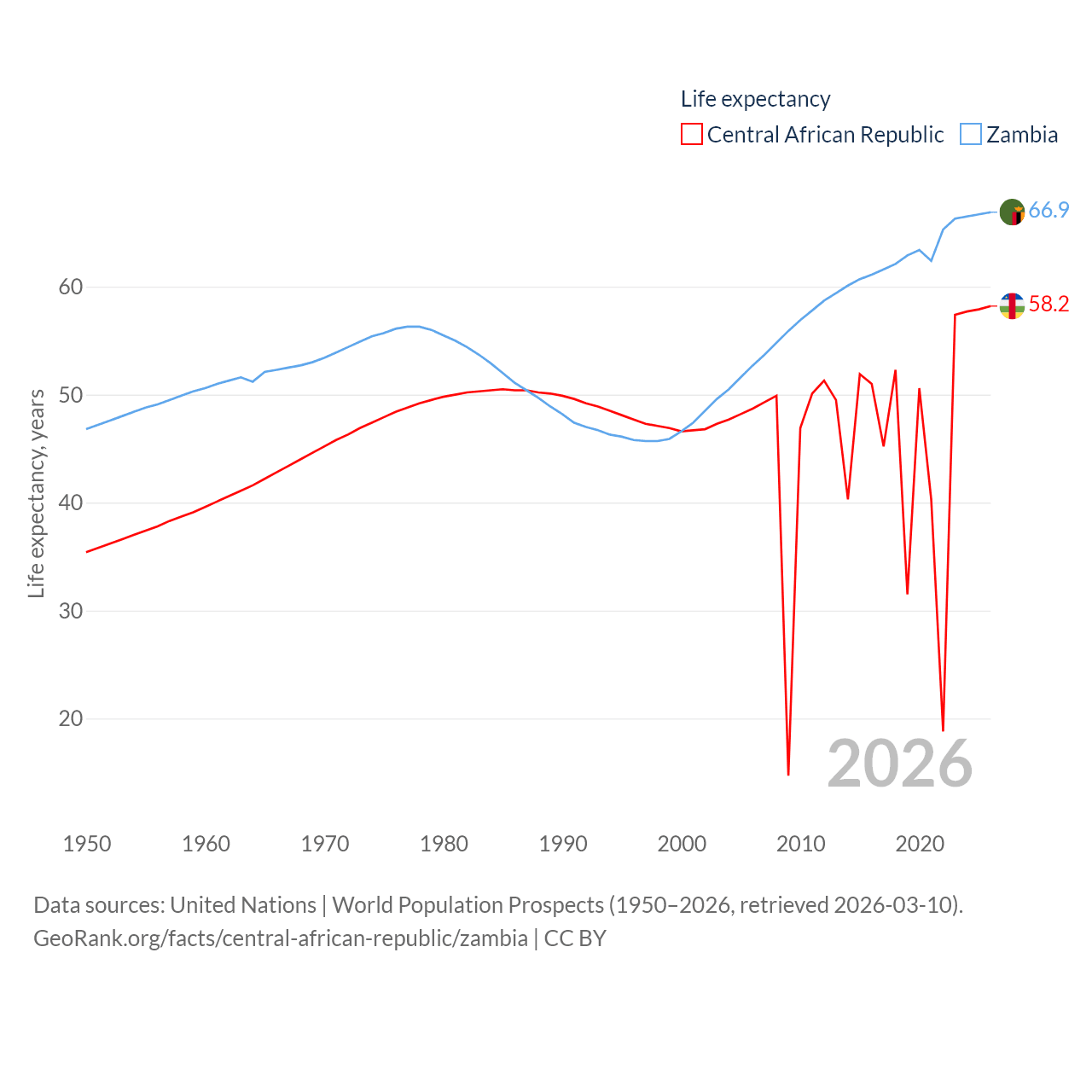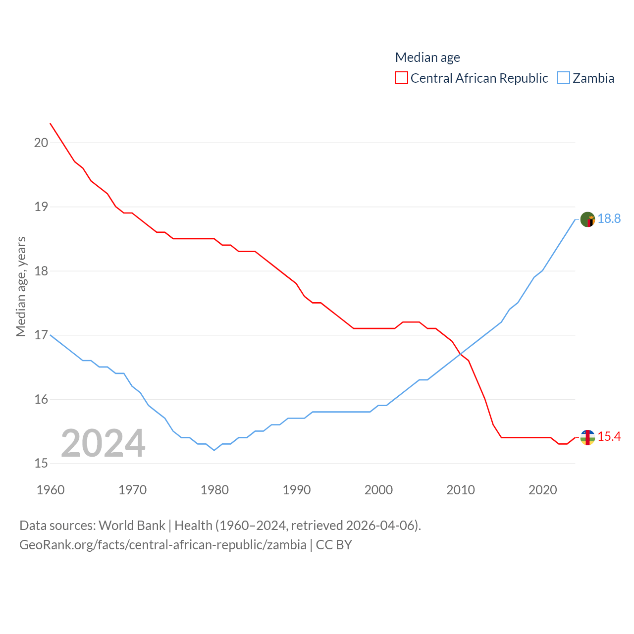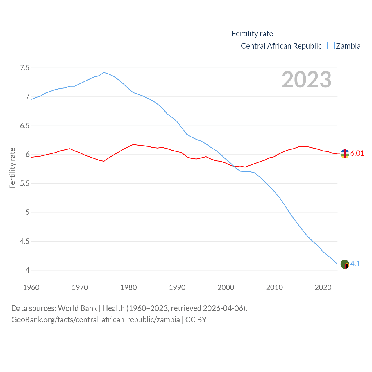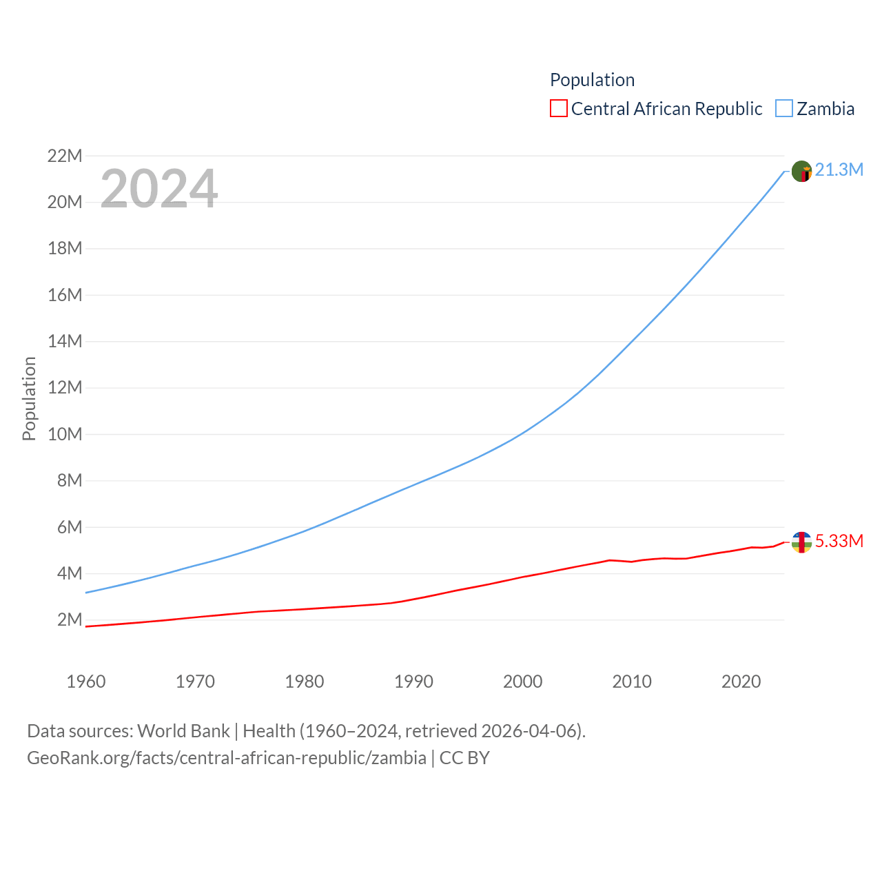 The Central African Republic has a population of 5.33M (ranked 121/197), compared with 21.3M in Zambia (ranked 63/197). The Central African Republic's land area is 240,534 sq mi versus 287,024 sq mi for Zambia (ranked 43rd vs. 37th).