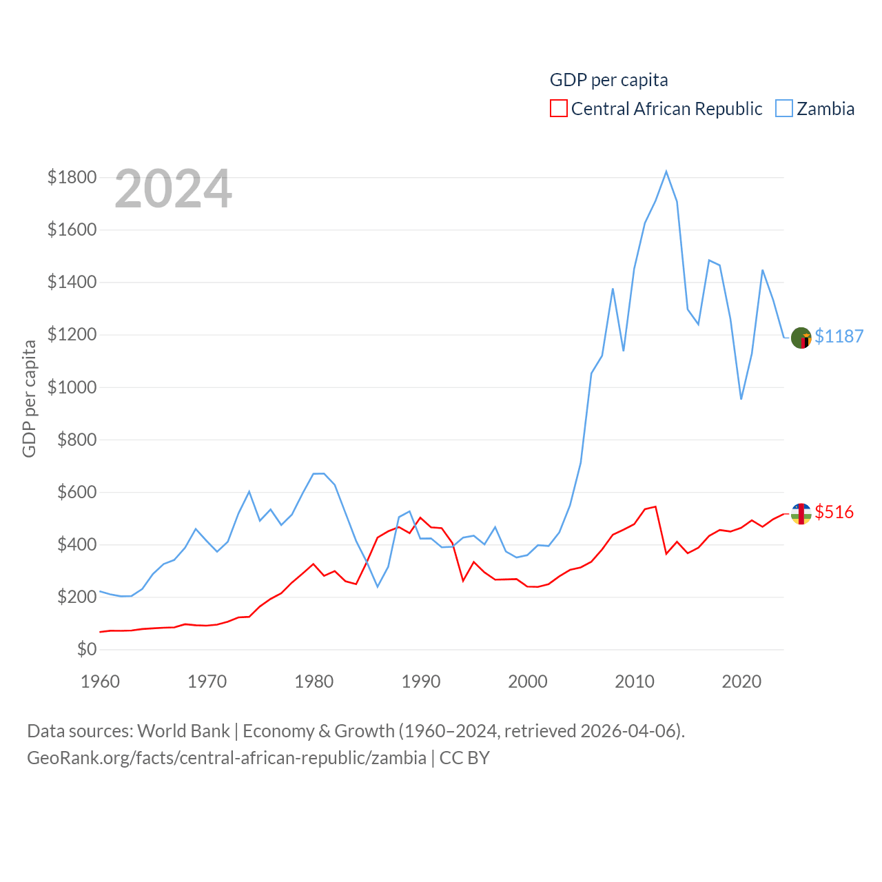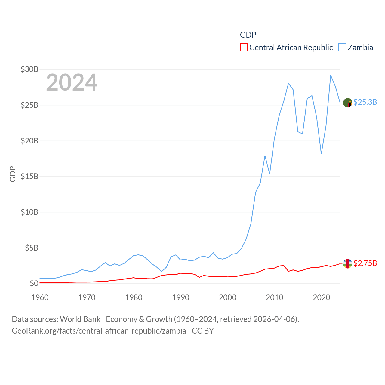By GDP, The Central African Republic ranks 171/197 ($2.75B) and Zambia ranks 116/197 ($25.3B). By GDP per capita, The Central African Republic ranks 195/197 ($516), while Zambia ranks 169/197 ($1,187).