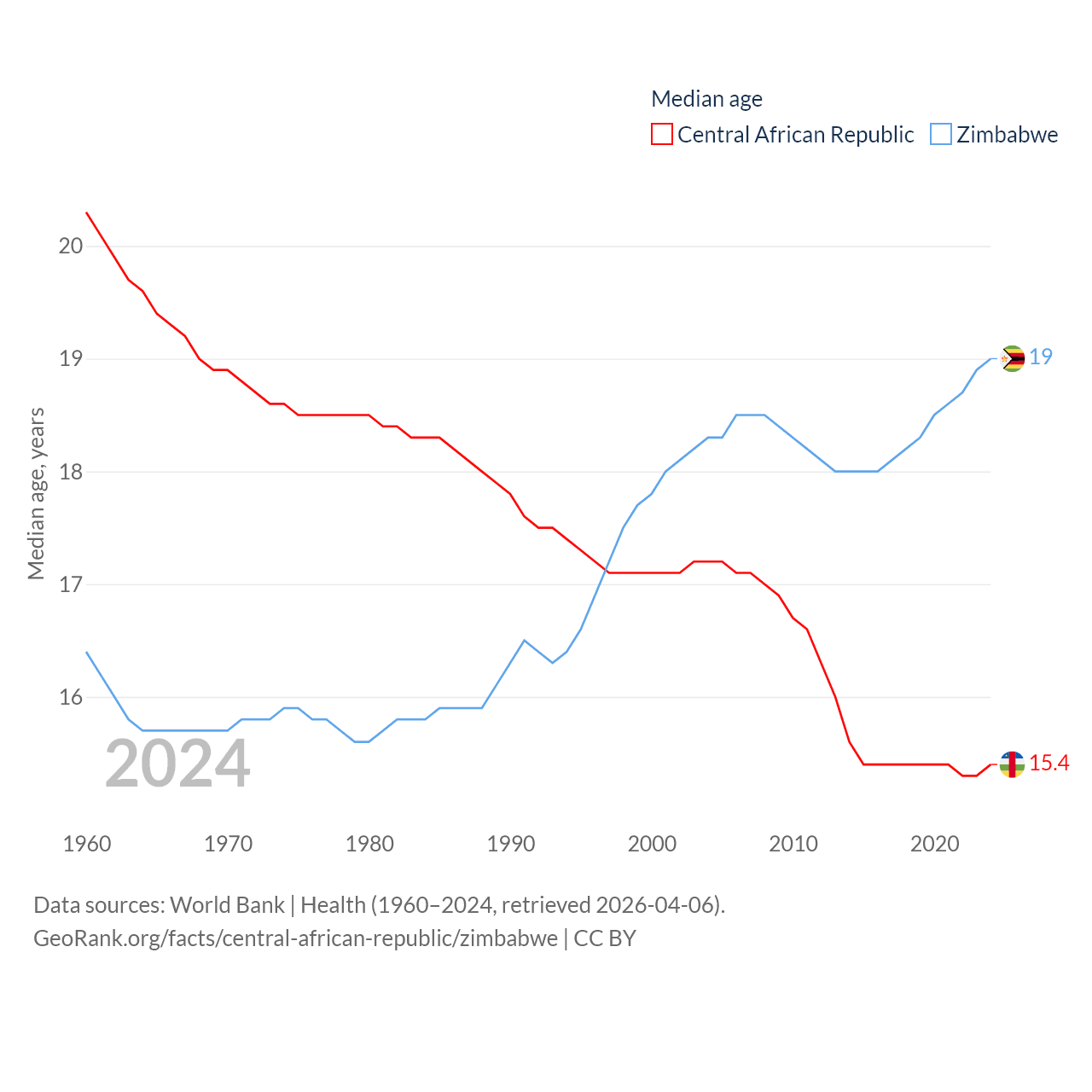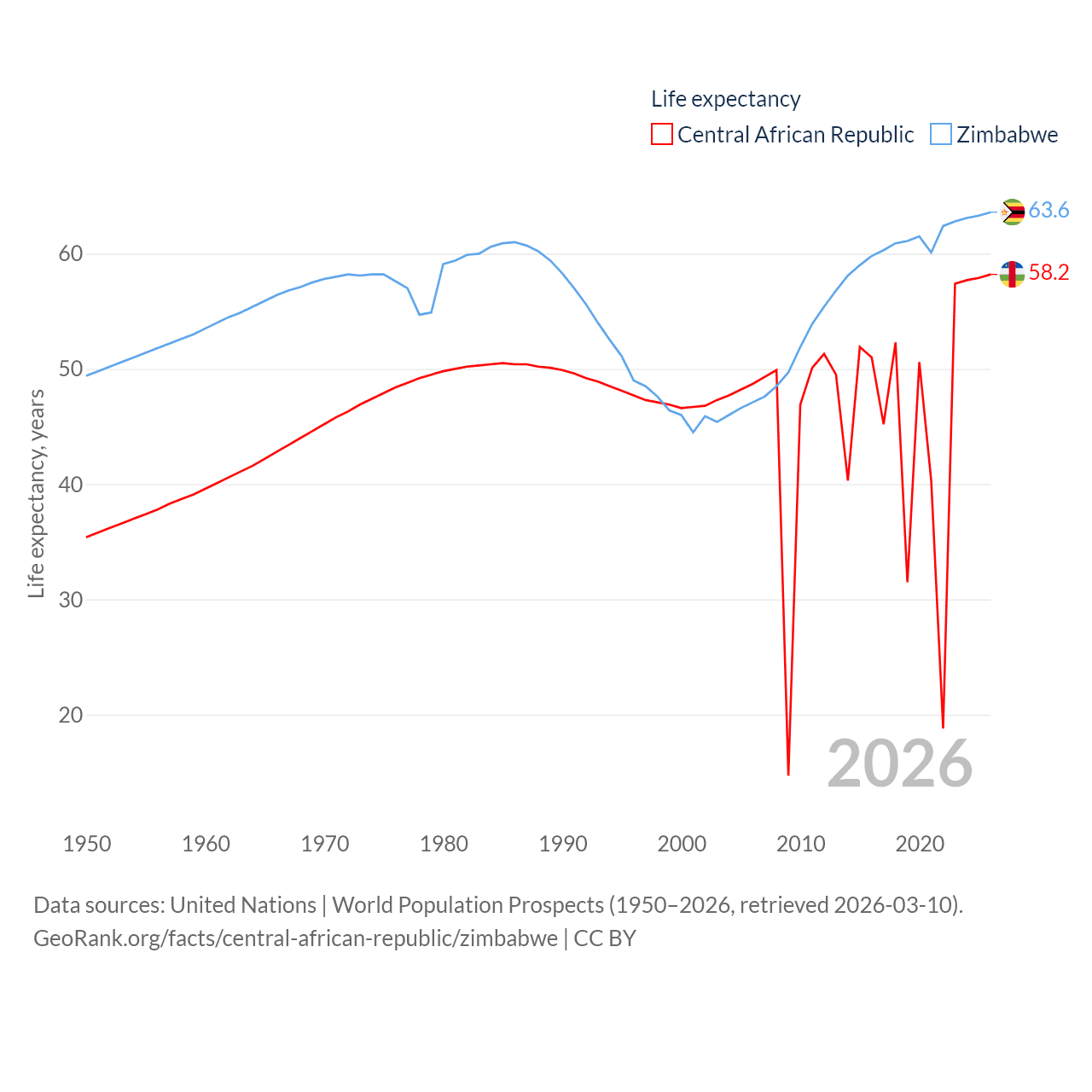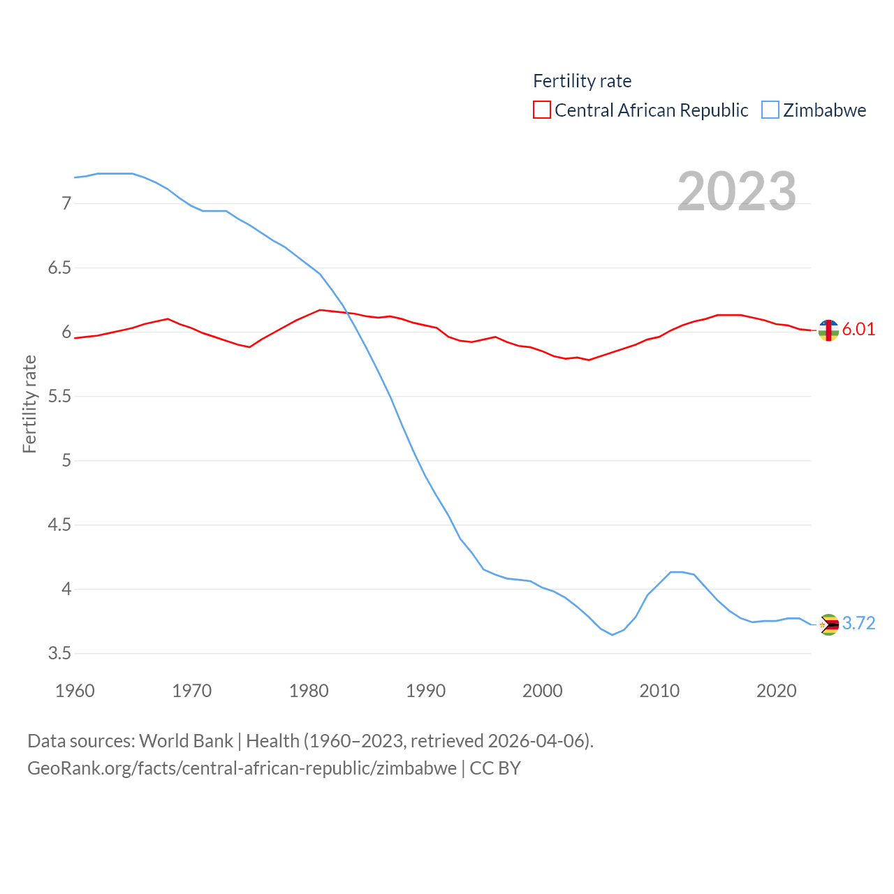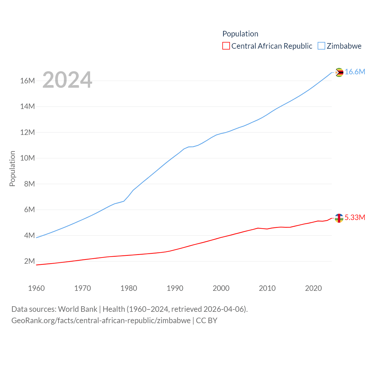 The Central African Republic has a population of 5.33M (ranked 121/197), compared with 16.6M in Zimbabwe (ranked 74/197). The Central African Republic's land area is 240,534 sq mi versus 149,364 sq mi for Zimbabwe (ranked 43rd vs. 60th).