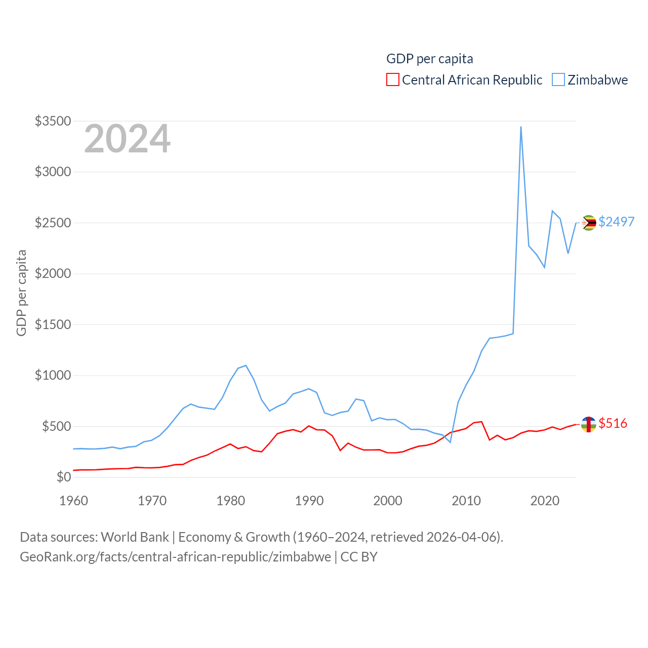 By GDP, The Central African Republic ranks 171/197 ($2.75B) and Zimbabwe ranks 102/197 ($41.5B). By GDP per capita, The Central African Republic ranks 195/197 ($516), while Zimbabwe ranks 148/197 ($2,497).