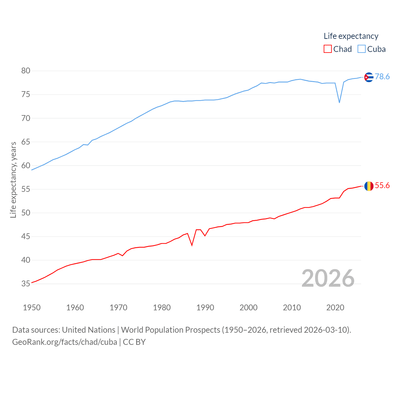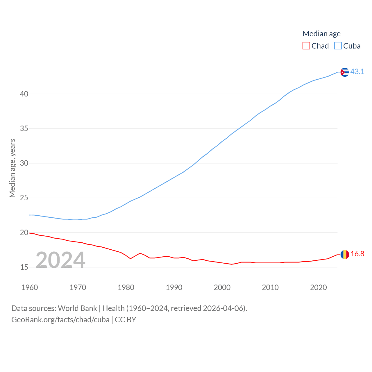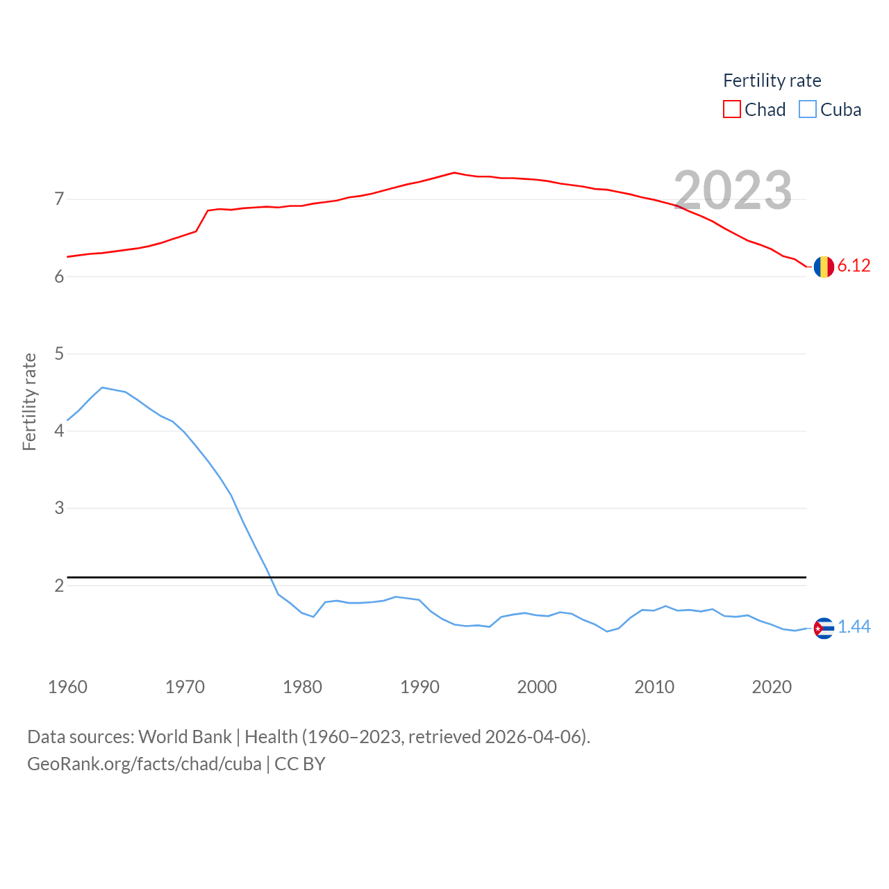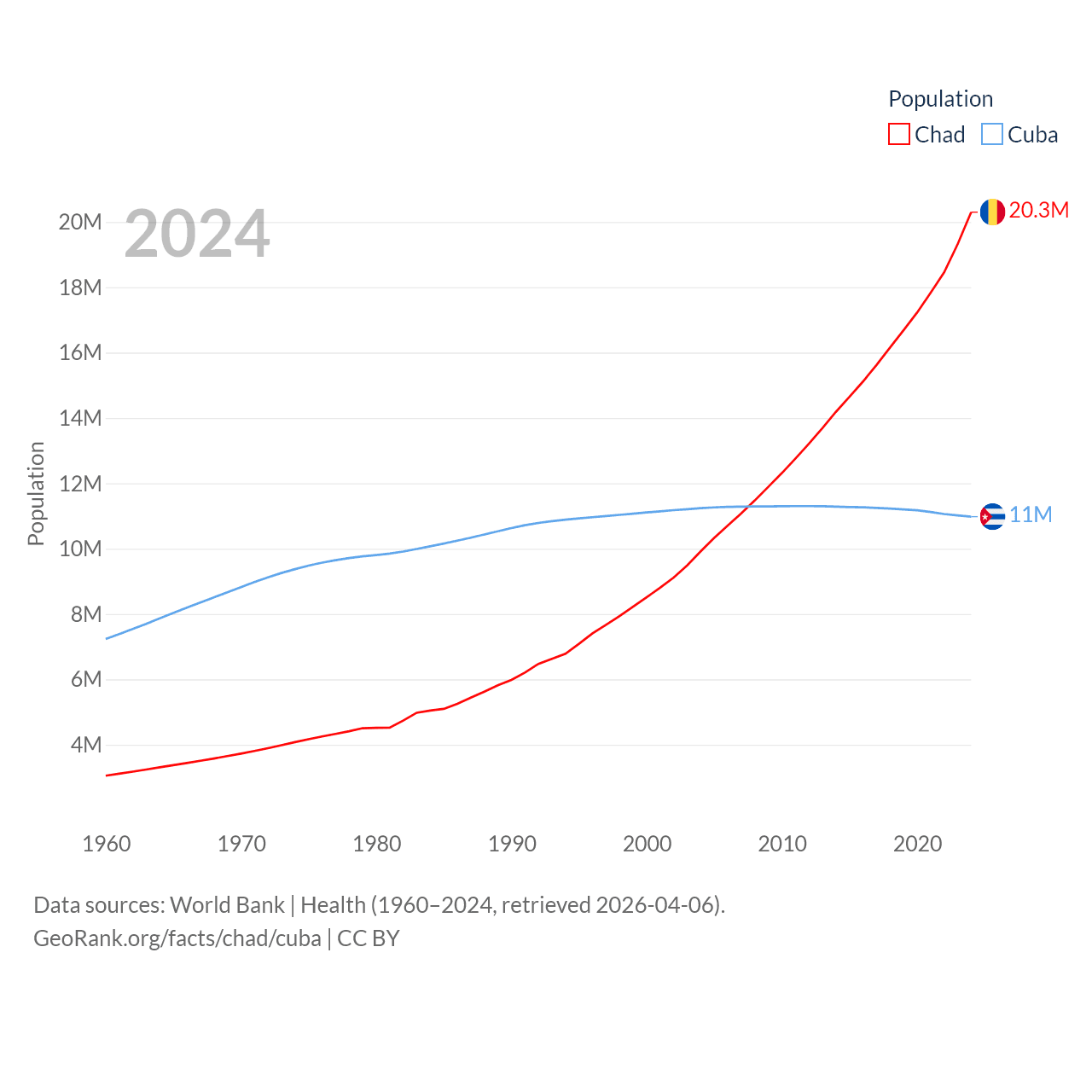Chad has a population of 20.3M (ranked 65/197), compared with 11M in Cuba (ranked 87/197). Chad's land area is 486,180 sq mi versus 40,077 sq mi for Cuba (ranked 21st vs. 103rd).