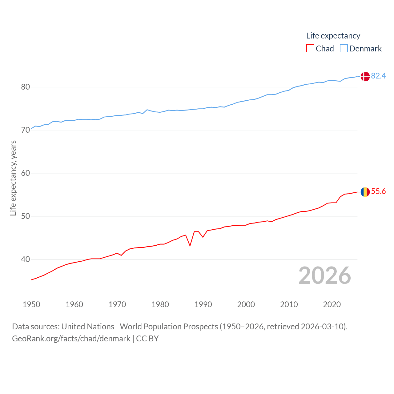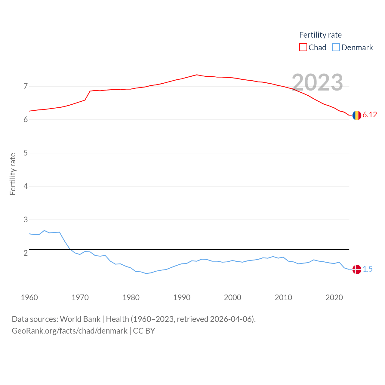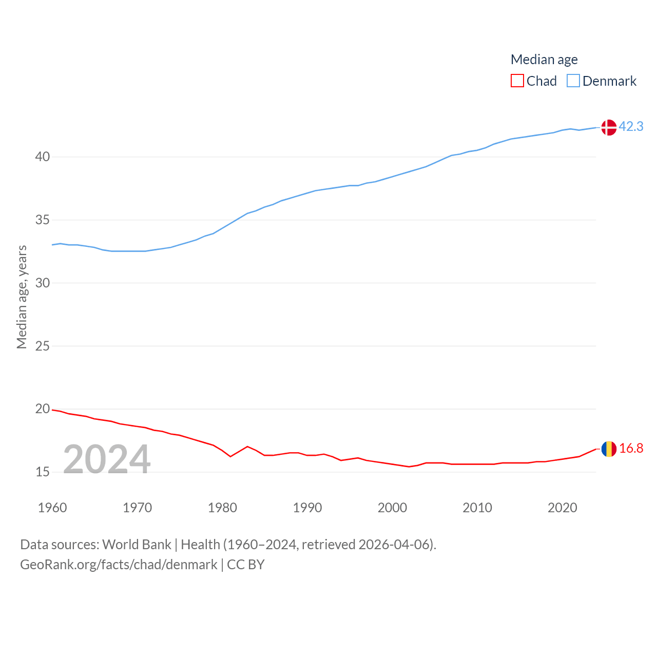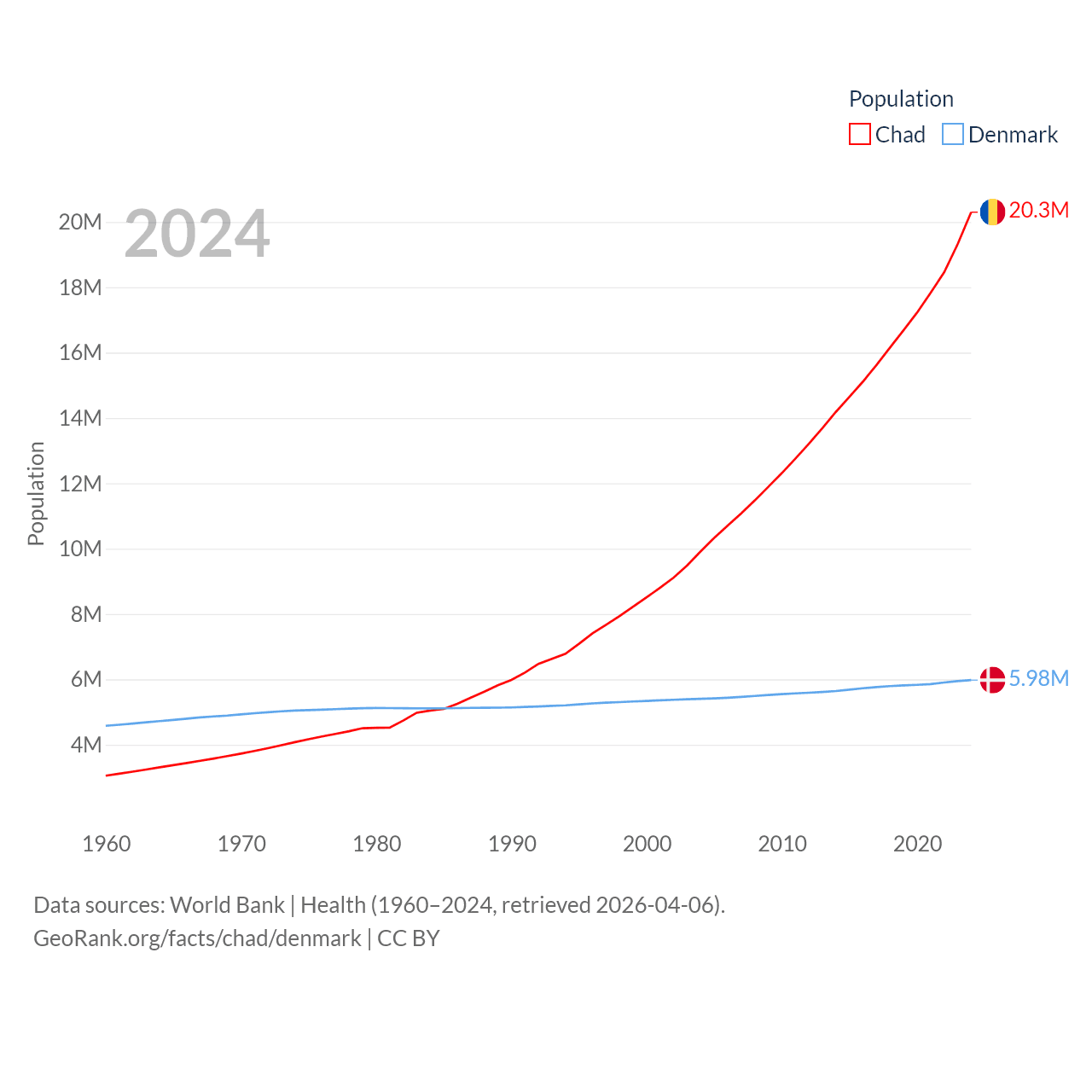 Chad has a population of 20.3M (ranked 65/197), compared with 5.98M in Denmark (ranked 114/197). Chad's land area is 486,180 sq mi versus 15,444 sq mi for Denmark (ranked 21st vs. 130th).