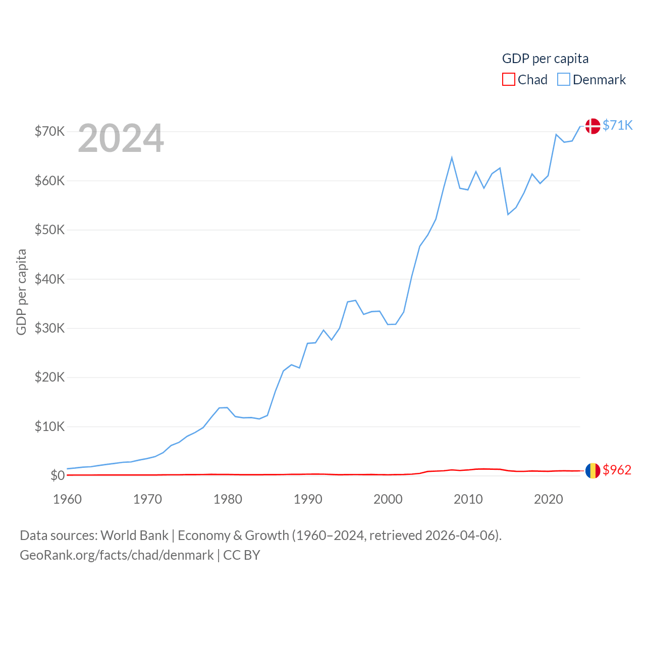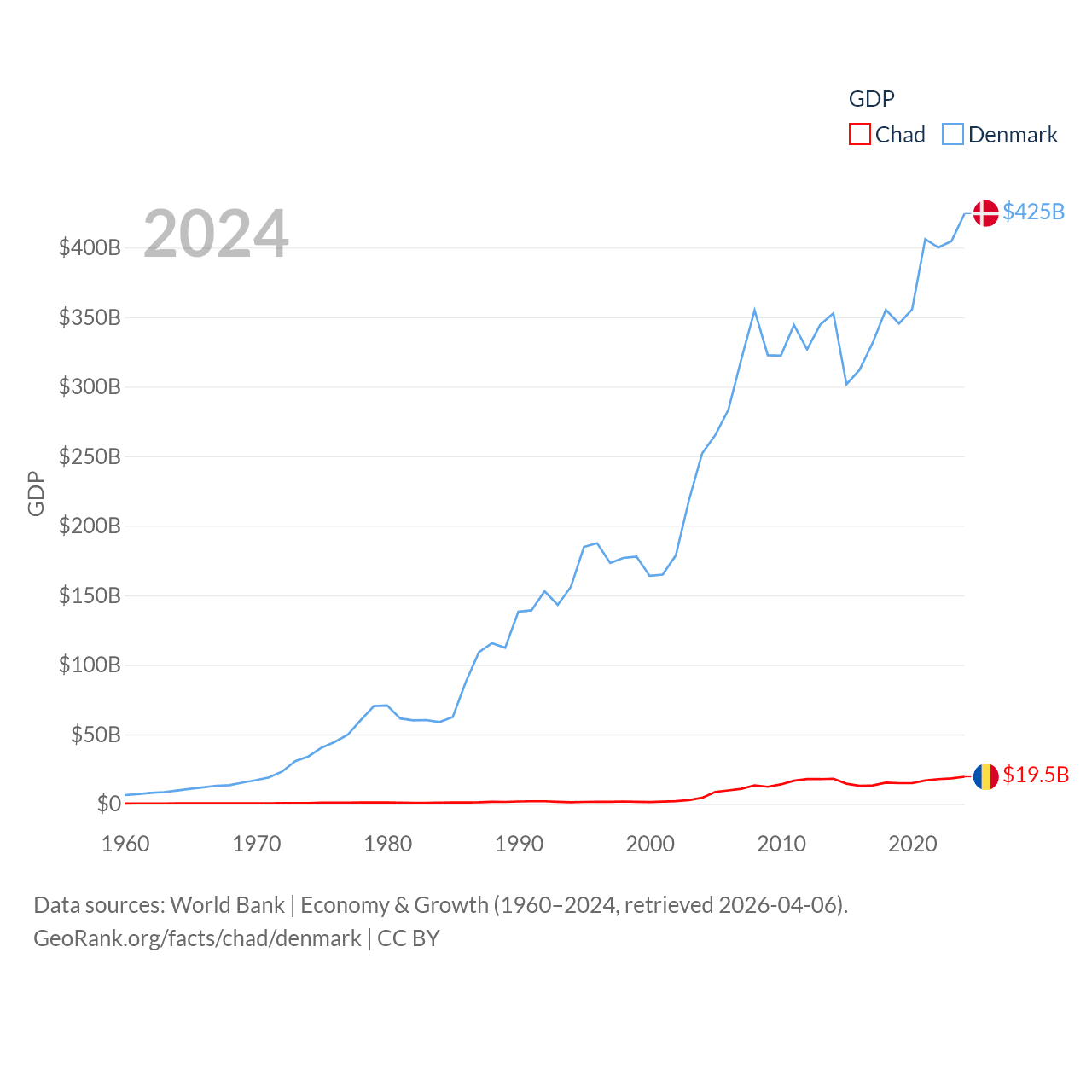 By GDP, Chad ranks 132/197 ($19.5B) and Denmark ranks 37/197 ($425B). By GDP per capita, Chad ranks 182/197 ($962), while Denmark ranks 12/197 ($71,026).