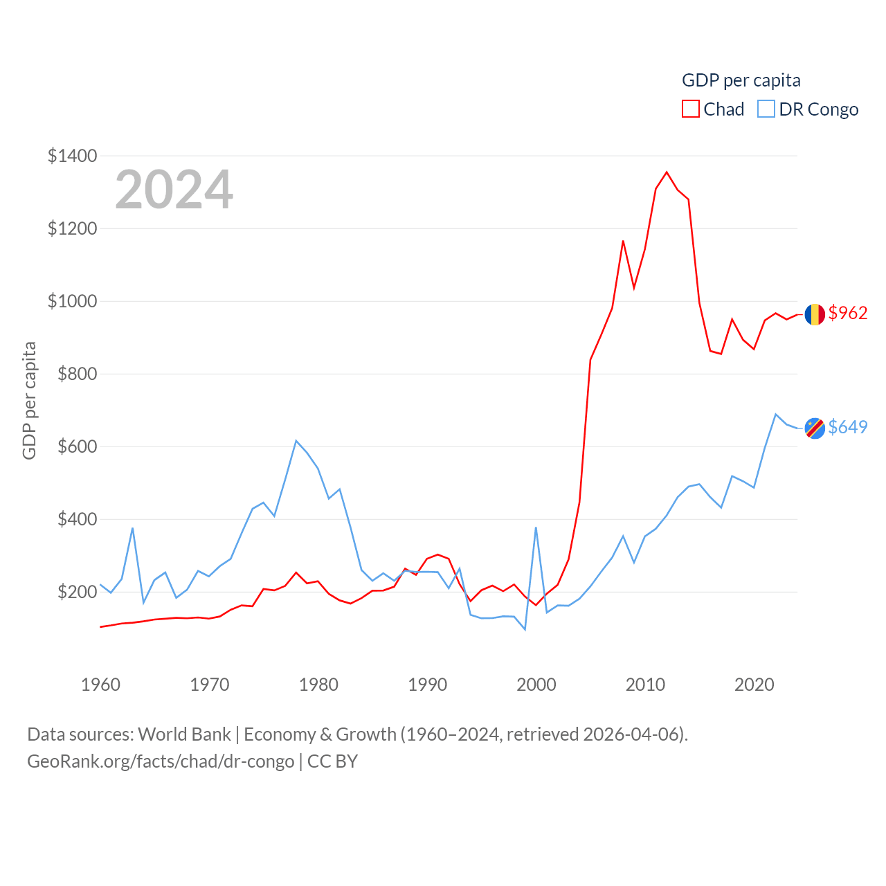 By GDP, Chad ranks 132/197 ($19.5B) and The DR Congo ranks 87/197 ($71B). By GDP per capita, Chad ranks 182/197 ($962), while The DR Congo ranks 190/197 ($649).