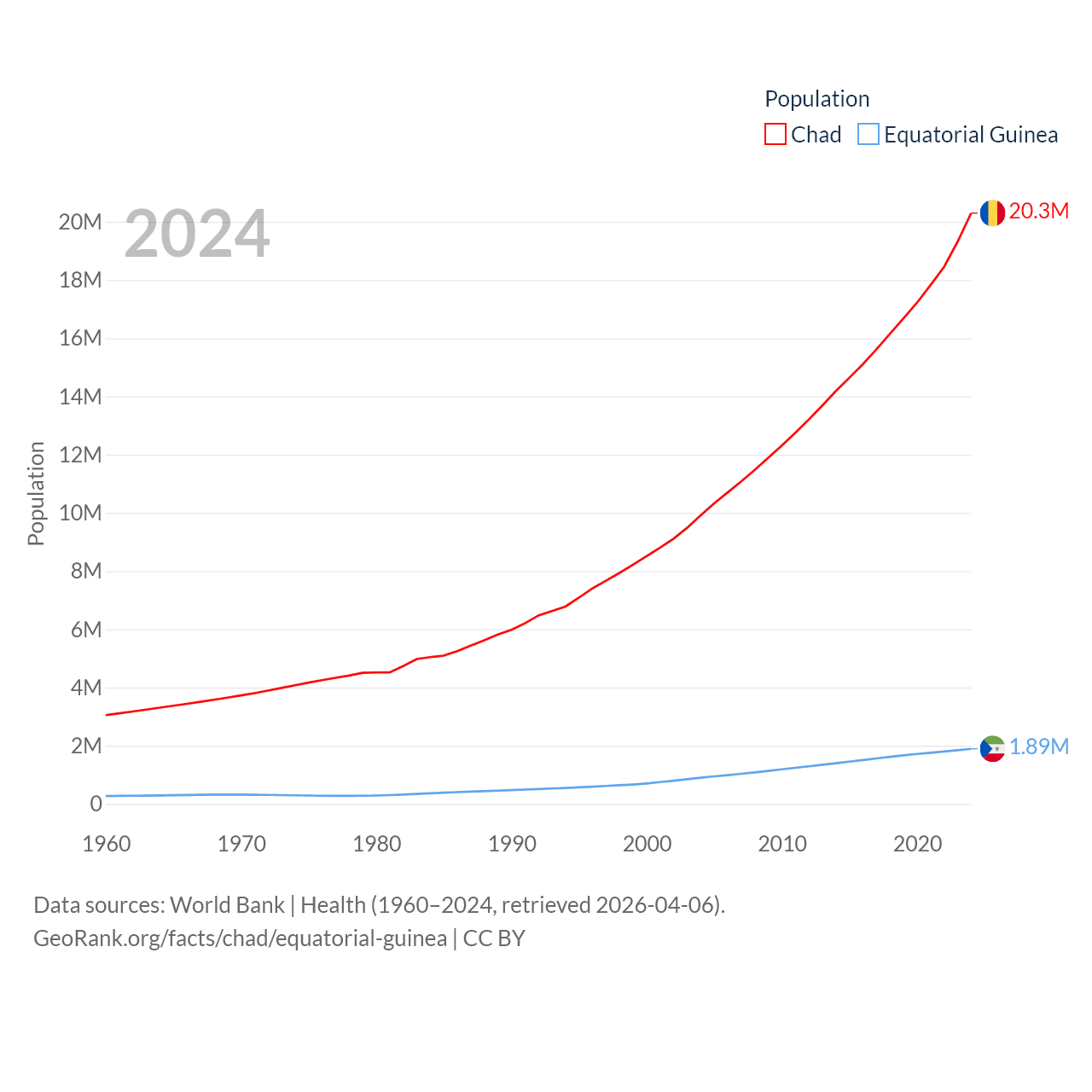 Chad has a population of 20.3M (ranked 65/197), compared with 1.89M in Equatorial Guinea (ranked 148/197). Chad's land area is 486,180 sq mi versus 10,830 sq mi for Equatorial Guinea (ranked 21st vs. 140th).