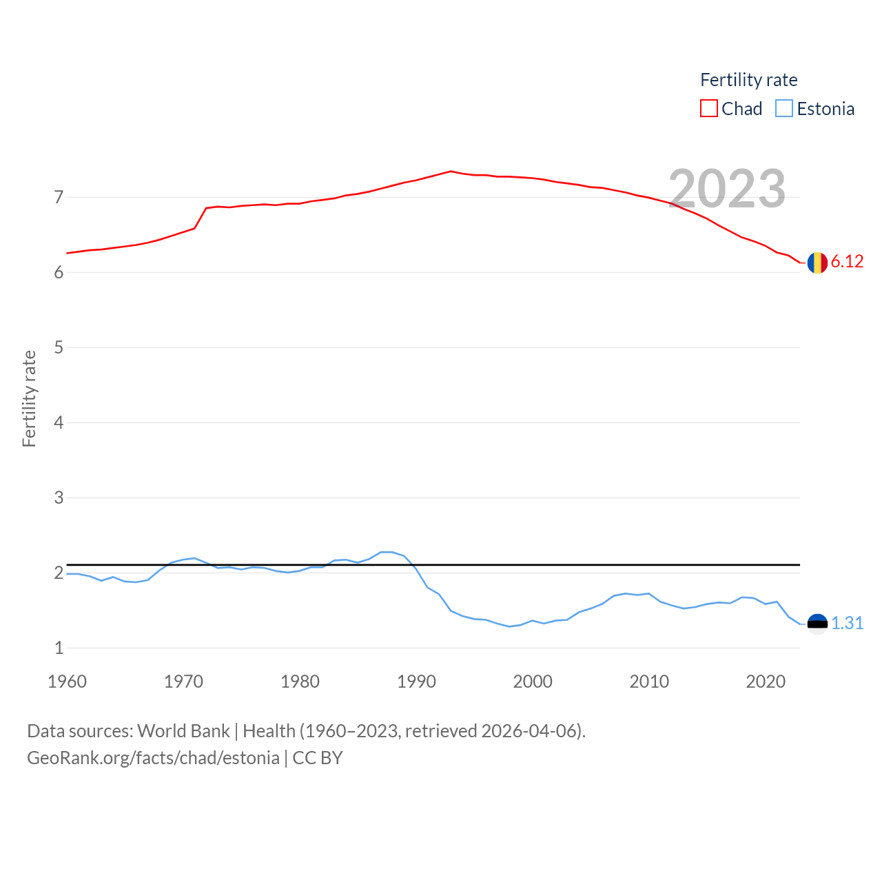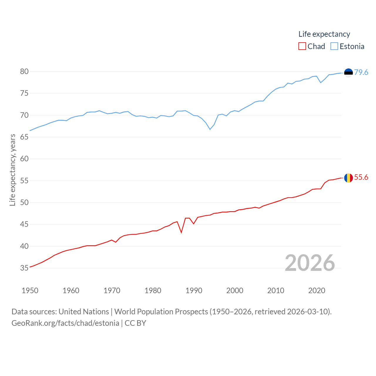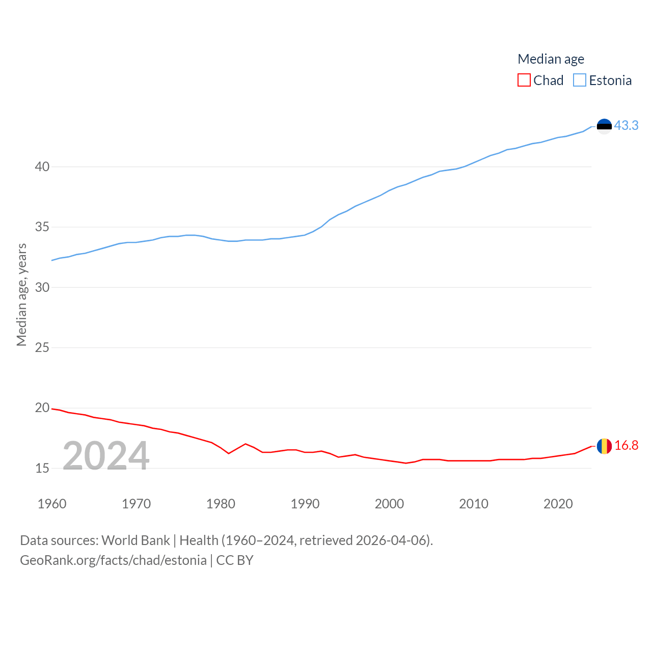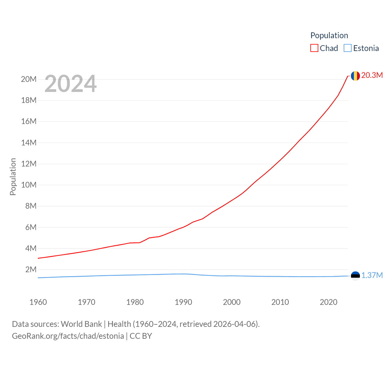 Chad has a population of 20.3M (ranked 65/197), compared with 1.37M in Estonia (ranked 153/197). Chad's land area is 486,180 sq mi versus 16,498 sq mi for Estonia (ranked 21st vs. 129th).
