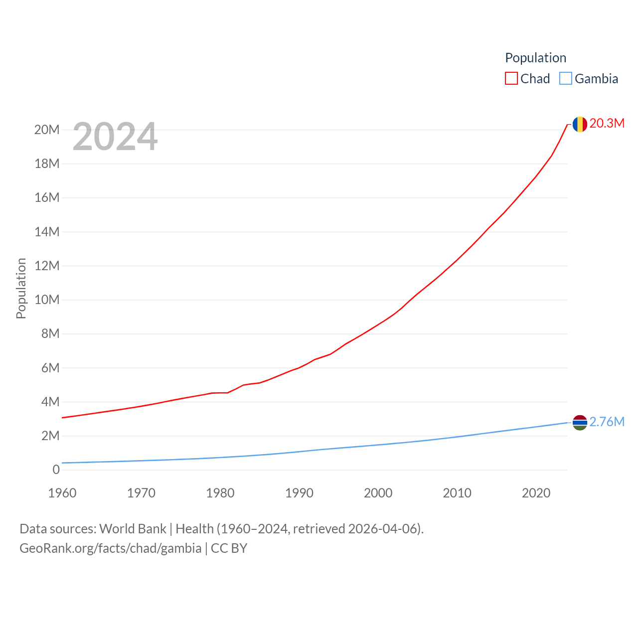 Chad has a population of 20.3M (ranked 65/197), compared with 2.76M in The Gambia (ranked 140/197). Chad's land area is 486,180 sq mi versus 3,907 sq mi for The Gambia (ranked 21st vs. 161st).