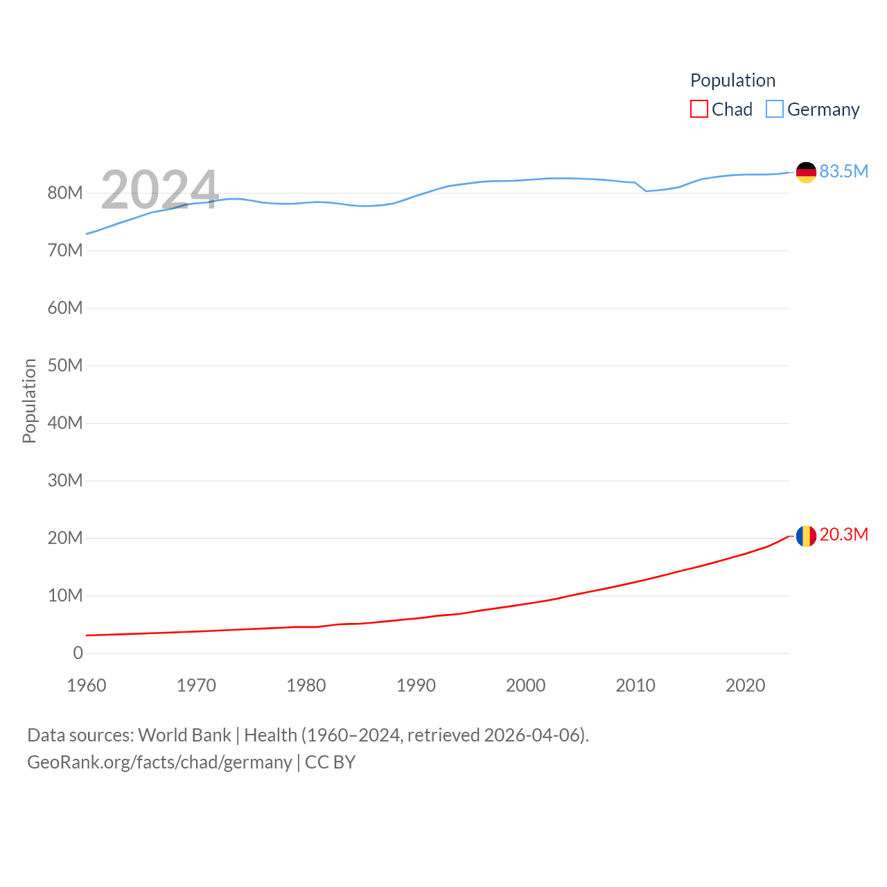 Chad has a population of 20.3M (ranked 65/197), compared with 83.5M in Germany (ranked 19/197). Chad's land area is 486,180 sq mi versus 134,916 sq mi for Germany (ranked 21st vs. 63rd).