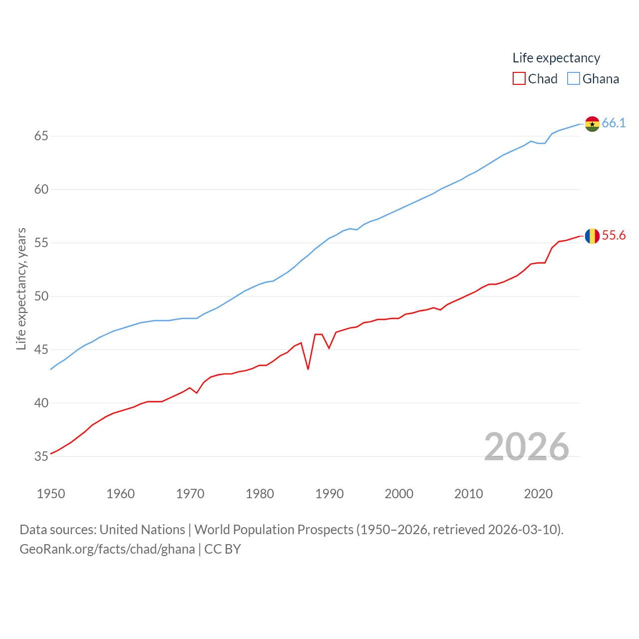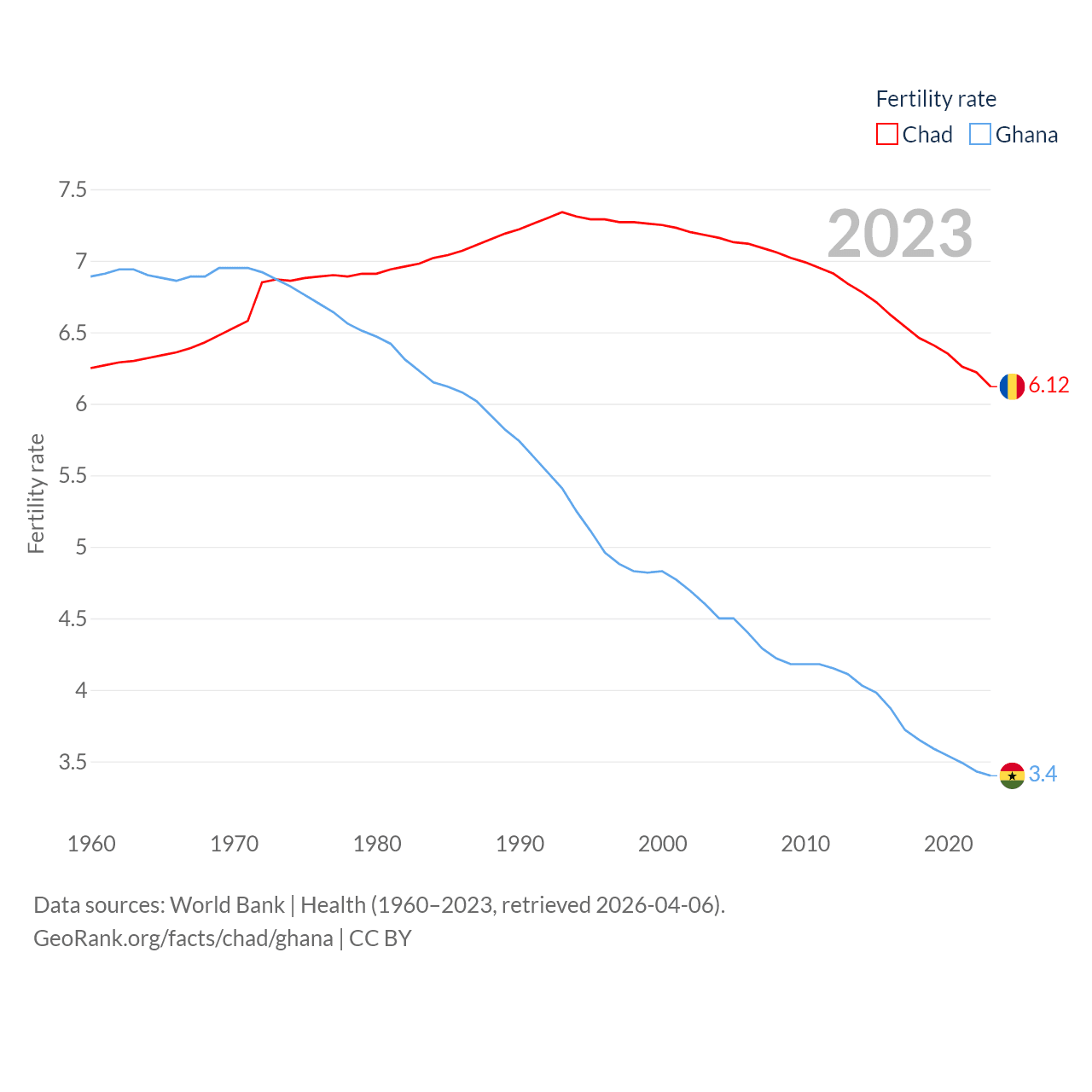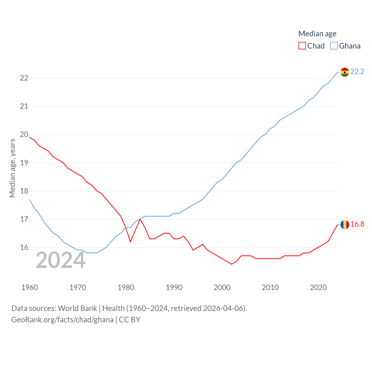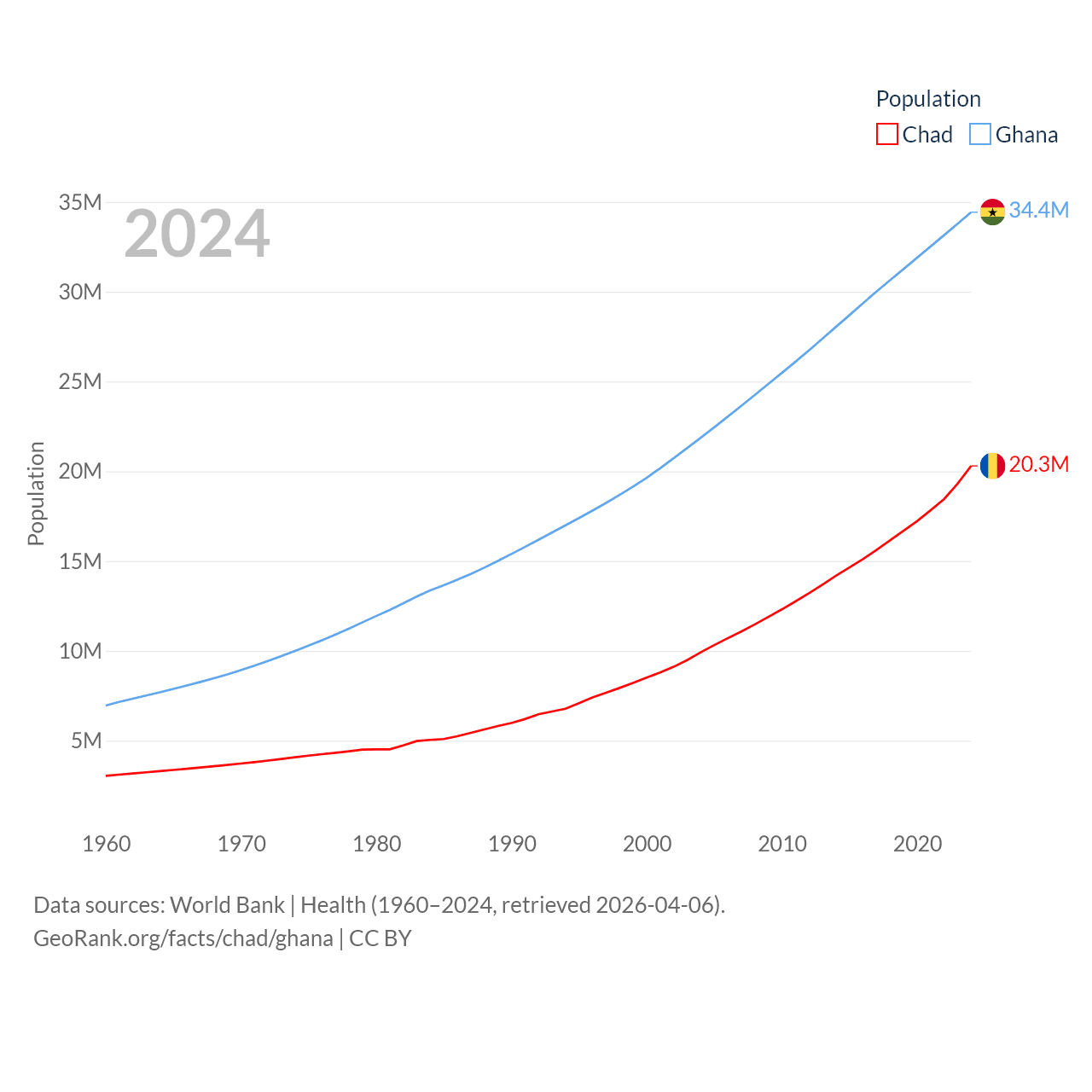 Chad has a population of 20.3M (ranked 65/197), compared with 34.4M in Ghana (ranked 47/197). Chad's land area is 486,180 sq mi versus 87,851 sq mi for Ghana (ranked 21st vs. 81st).