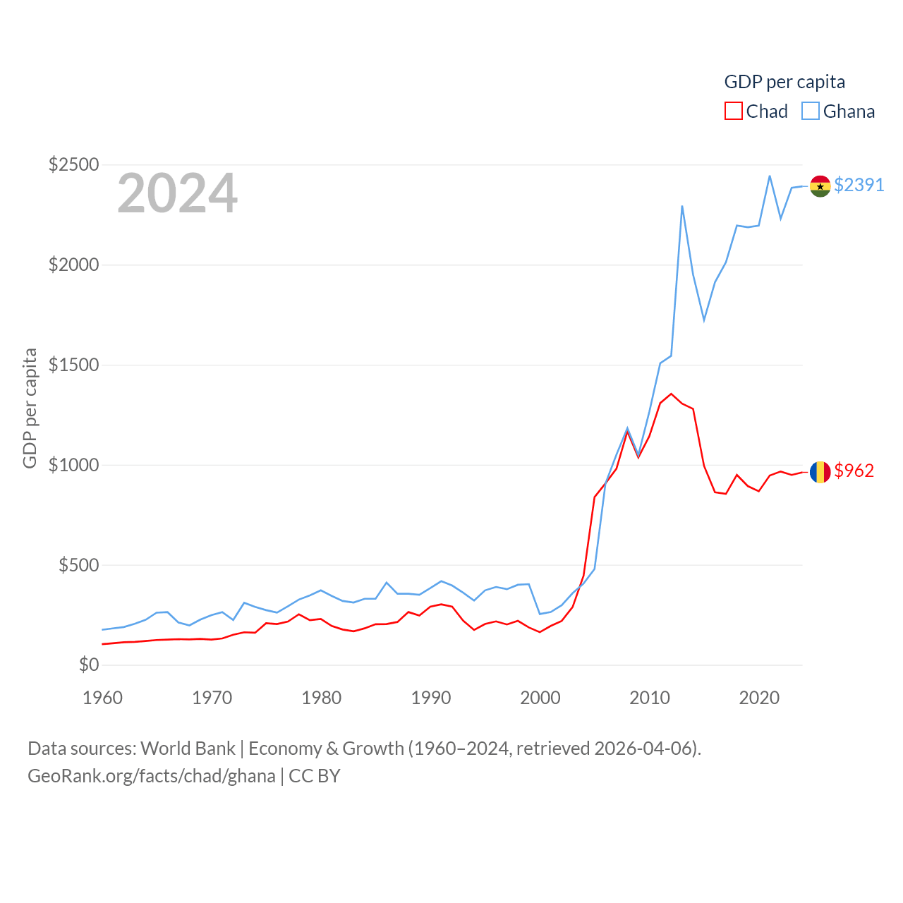 By GDP, Chad ranks 132/197 ($19.5B) and Ghana ranks 80/197 ($82.3B). By GDP per capita, Chad ranks 182/197 ($962), while Ghana ranks 151/197 ($2,391).
