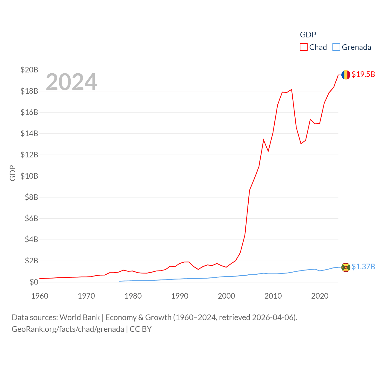 By GDP, Chad ranks 132/197 ($19.5B) and Grenada ranks 184/197 ($1.37B). By GDP per capita, Chad ranks 182/197 ($962), while Grenada ranks 80/197 ($11,705).