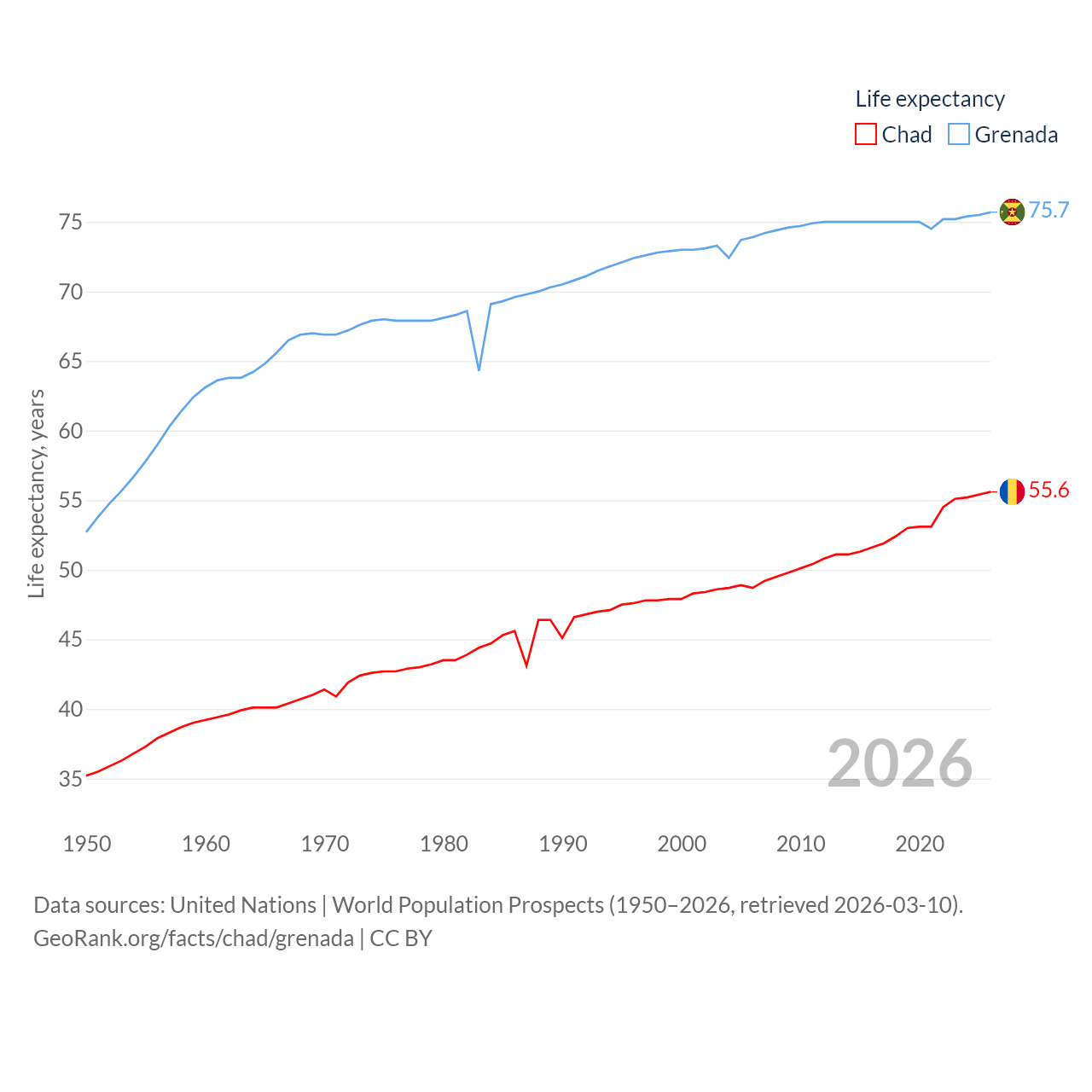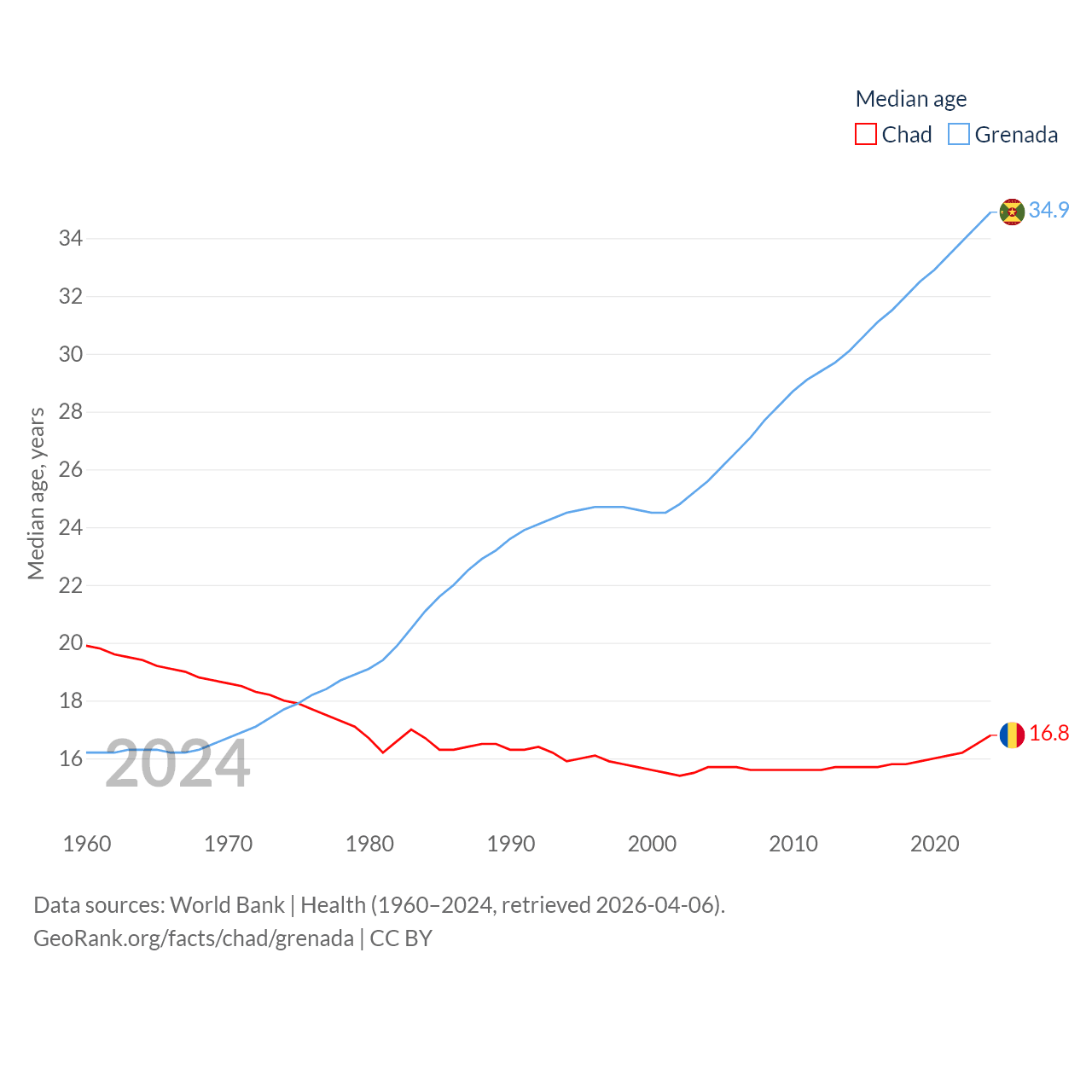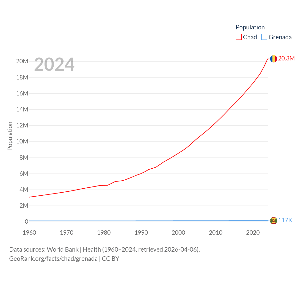 Chad has a population of 20.3M (ranked 65/197), compared with 117K in Grenada (ranked 182/197). Chad's land area is 486,180 sq mi versus 131.3 sq mi for Grenada (ranked 21st vs. 186th).
