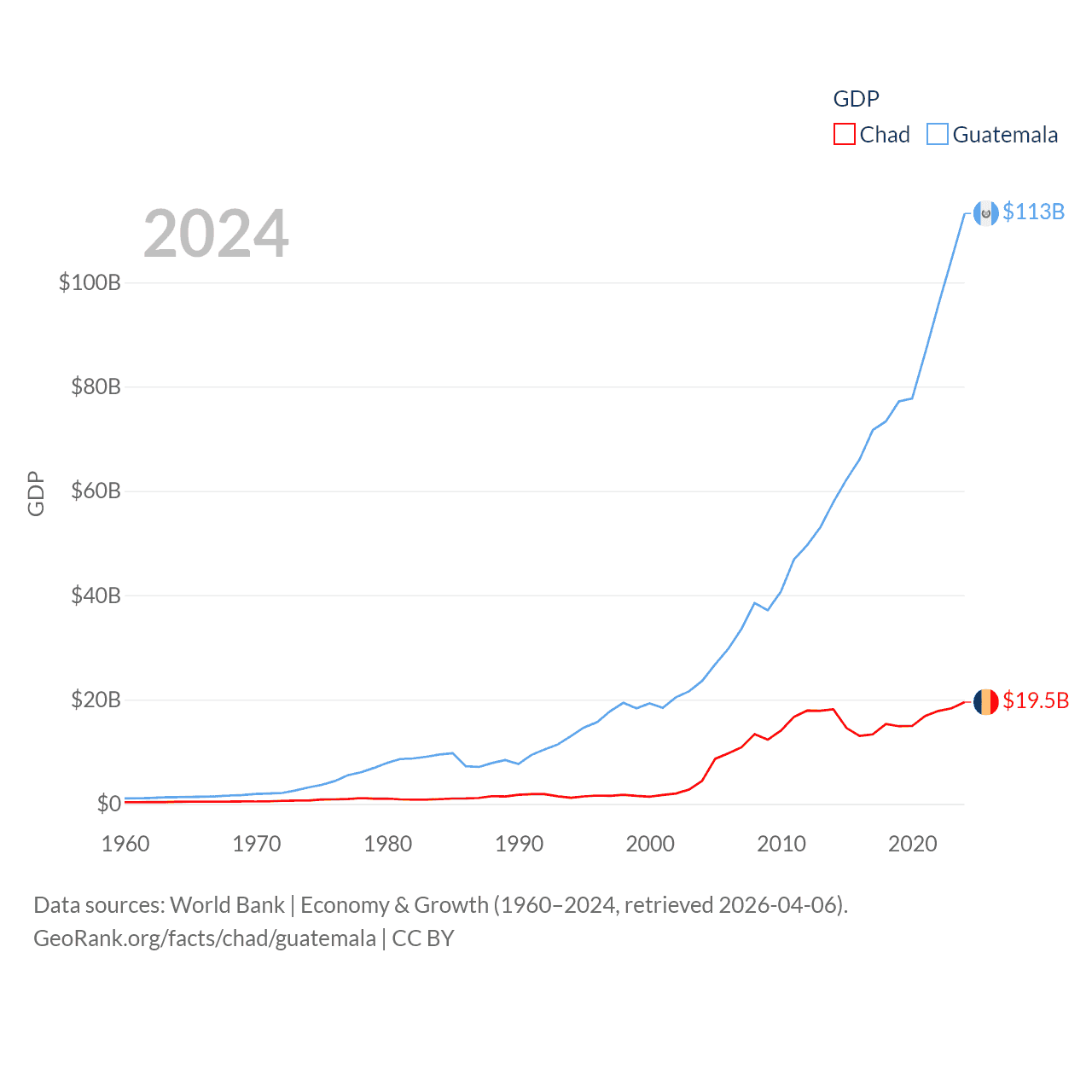 By GDP, Chad ranks 132/197 ($19.5B) and Guatemala ranks 68/197 ($113B). By GDP per capita, Chad ranks 182/197 ($962), while Guatemala ranks 112/197 ($6,150).