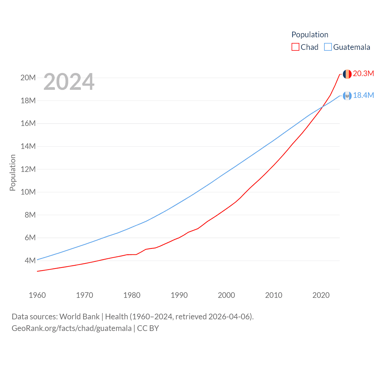 Chad has a population of 20.3M (ranked 65/197), compared with 18.4M in Guatemala (ranked 70/197). Chad's land area is 486,180 sq mi versus 41,375 sq mi for Guatemala (ranked 21st vs. 102nd).