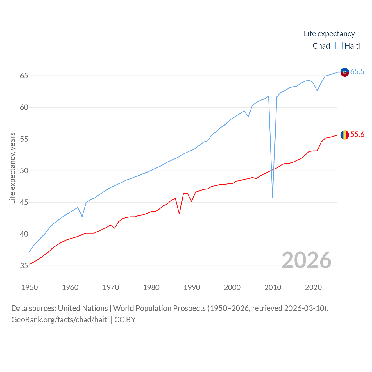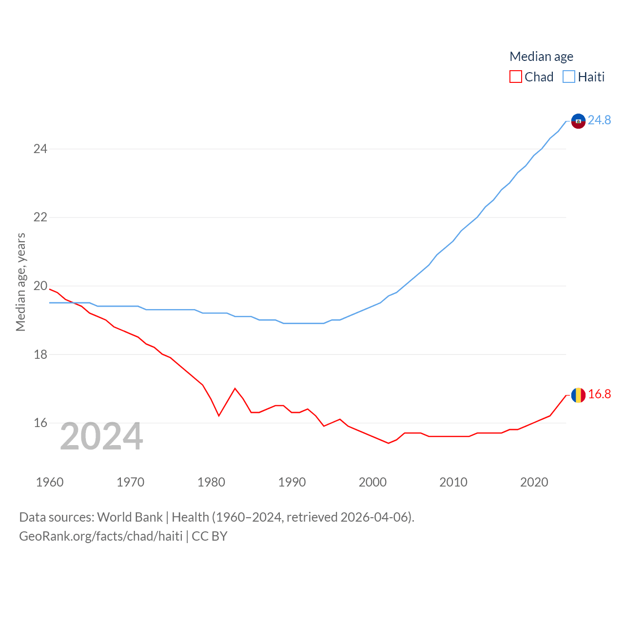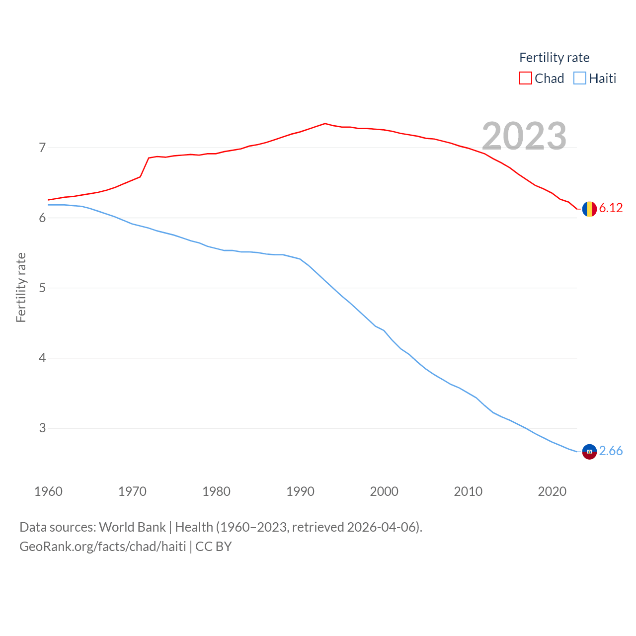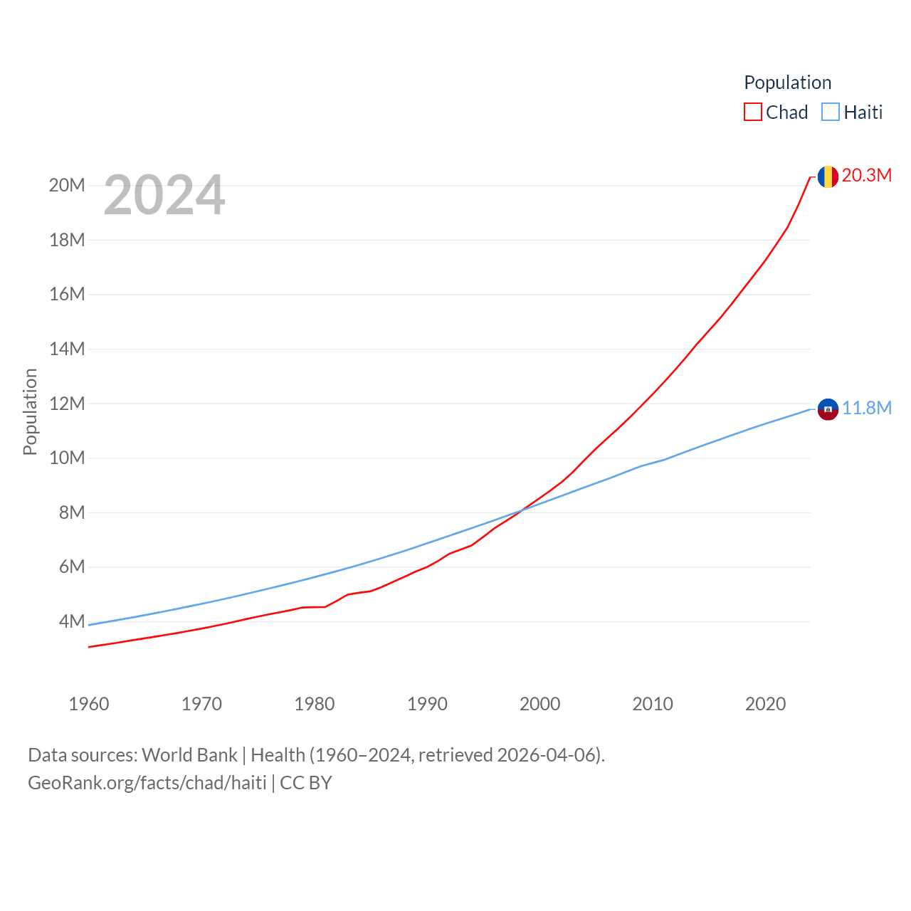 Chad has a population of 20.3M (ranked 65/197), compared with 11.8M in Haiti (ranked 83/197). Chad's land area is 486,180 sq mi versus 10,641 sq mi for Haiti (ranked 21st vs. 142nd).