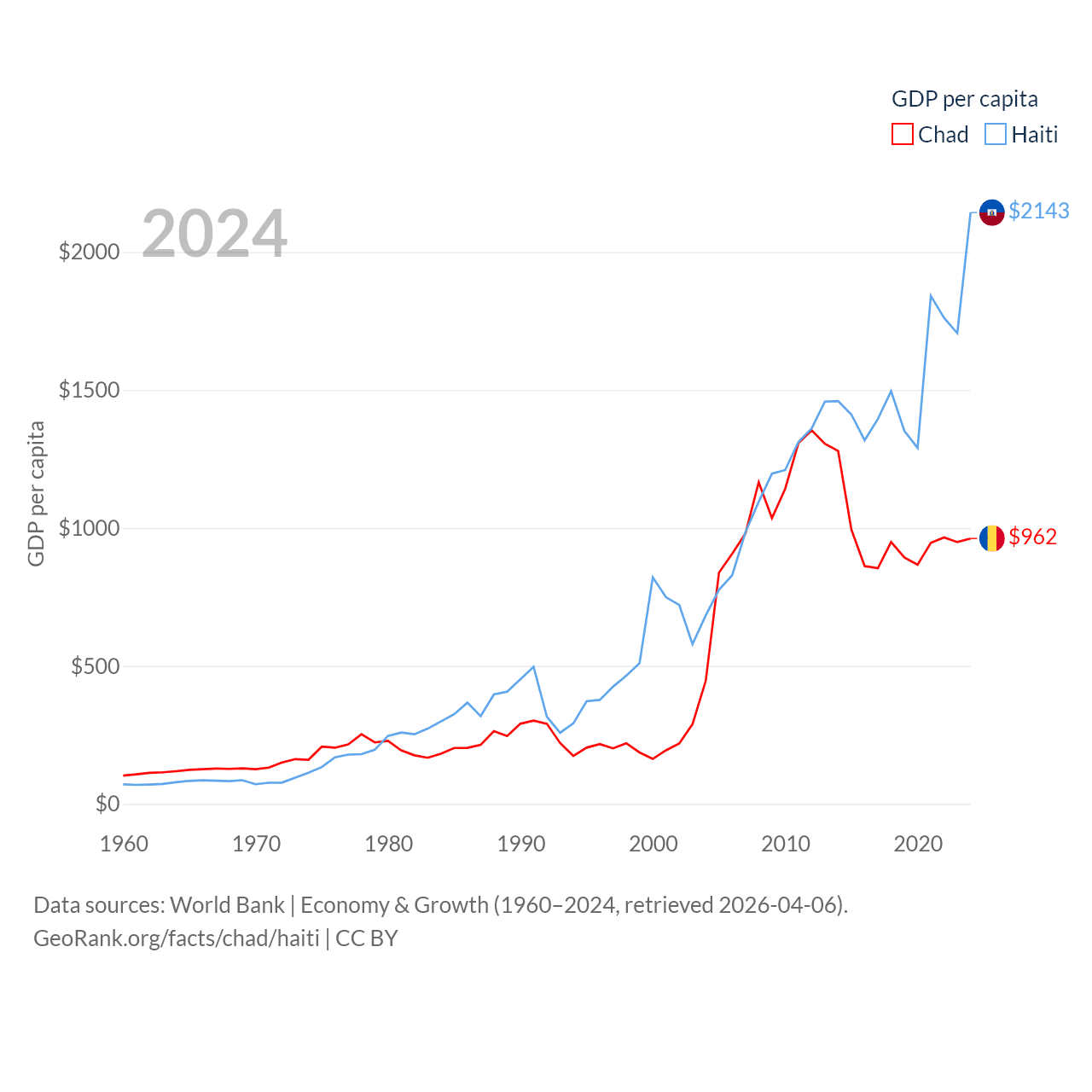 By GDP, Chad ranks 132/197 ($19.5B) and Haiti ranks 117/197 ($25.2B). By GDP per capita, Chad ranks 182/197 ($962), while Haiti ranks 153/197 ($2,143).
