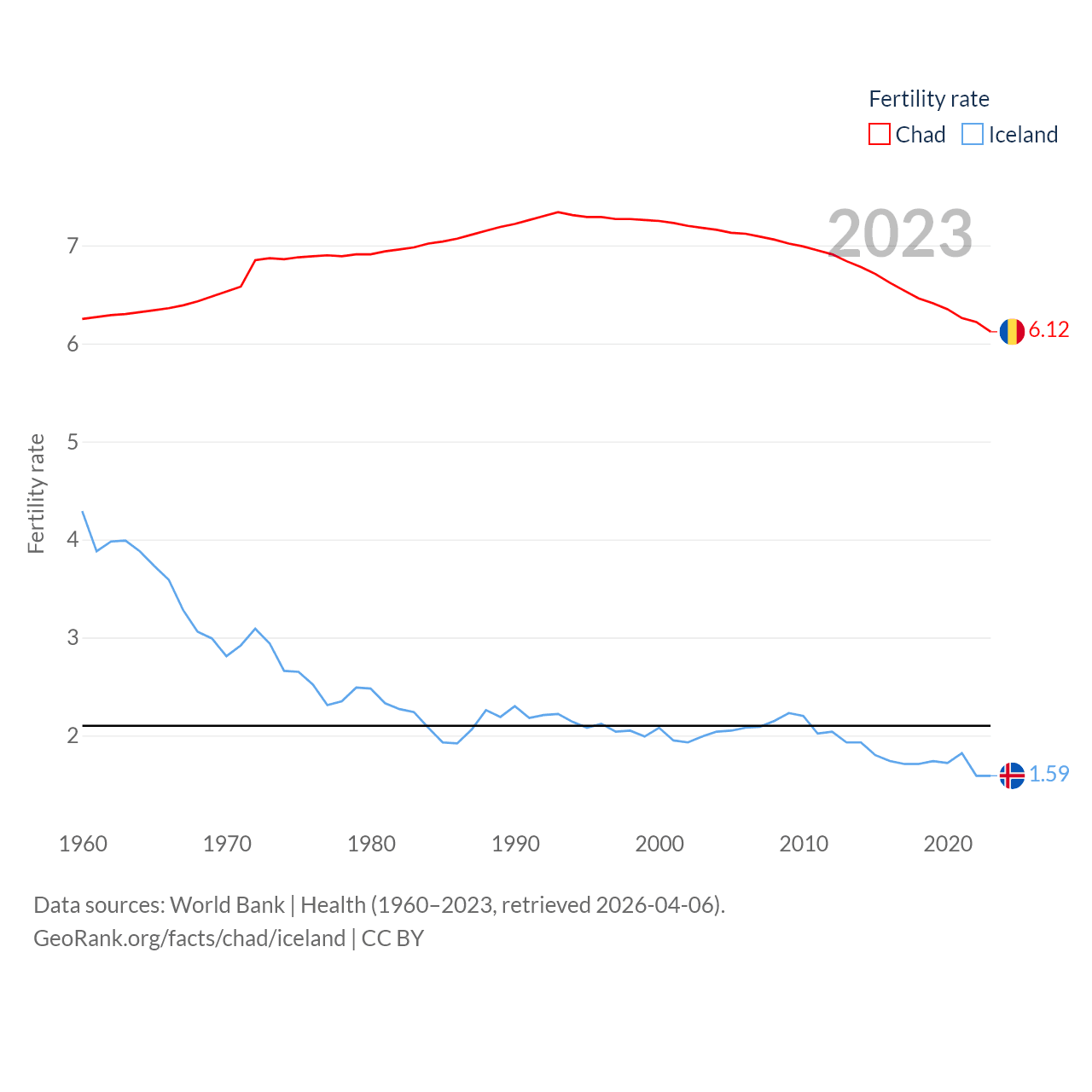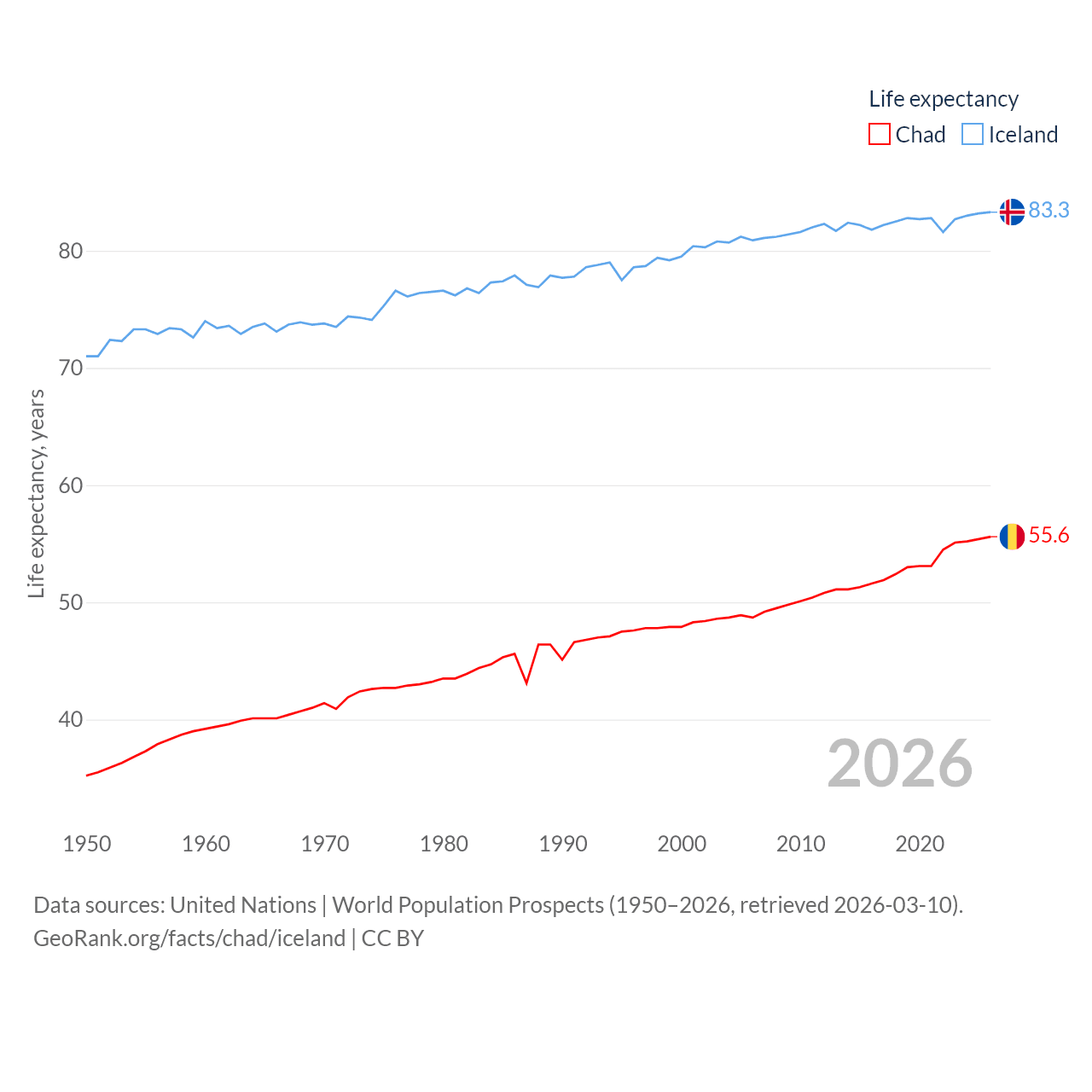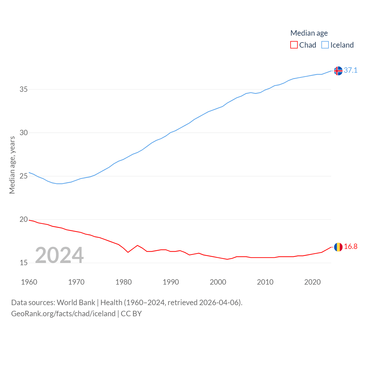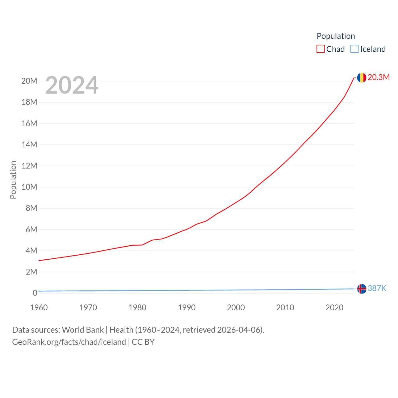 Chad has a population of 20.3M (ranked 65/197), compared with 387K in Iceland (ranked 173/197). Chad's land area is 486,180 sq mi versus 38,931 sq mi for Iceland (ranked 21st vs. 104th).