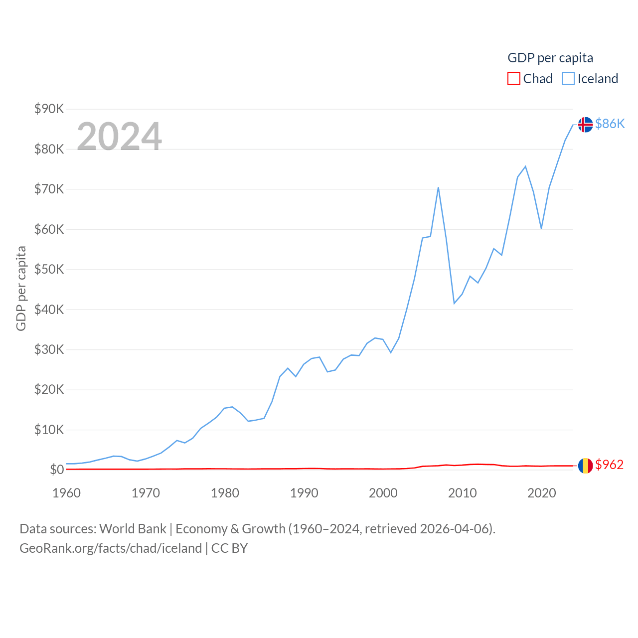 By GDP, Chad ranks 132/197 ($19.5B) and Iceland ranks 108/197 ($33.3B). By GDP per capita, Chad ranks 182/197 ($962), while Iceland ranks 9/197 ($86,041).