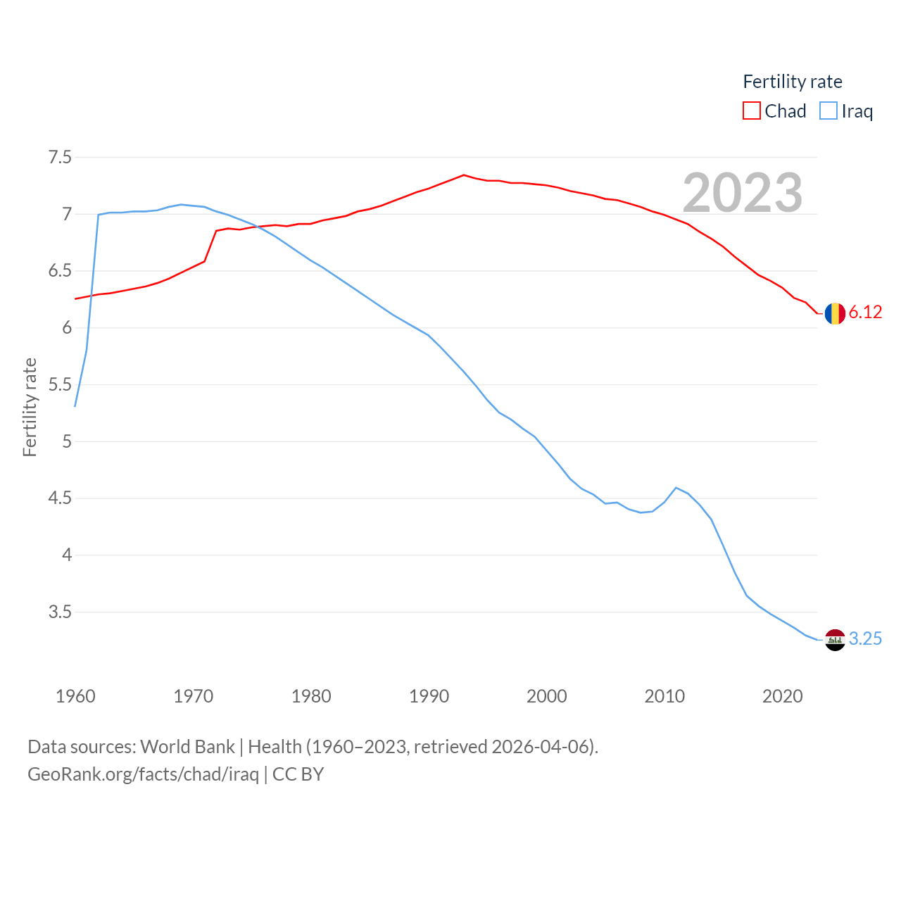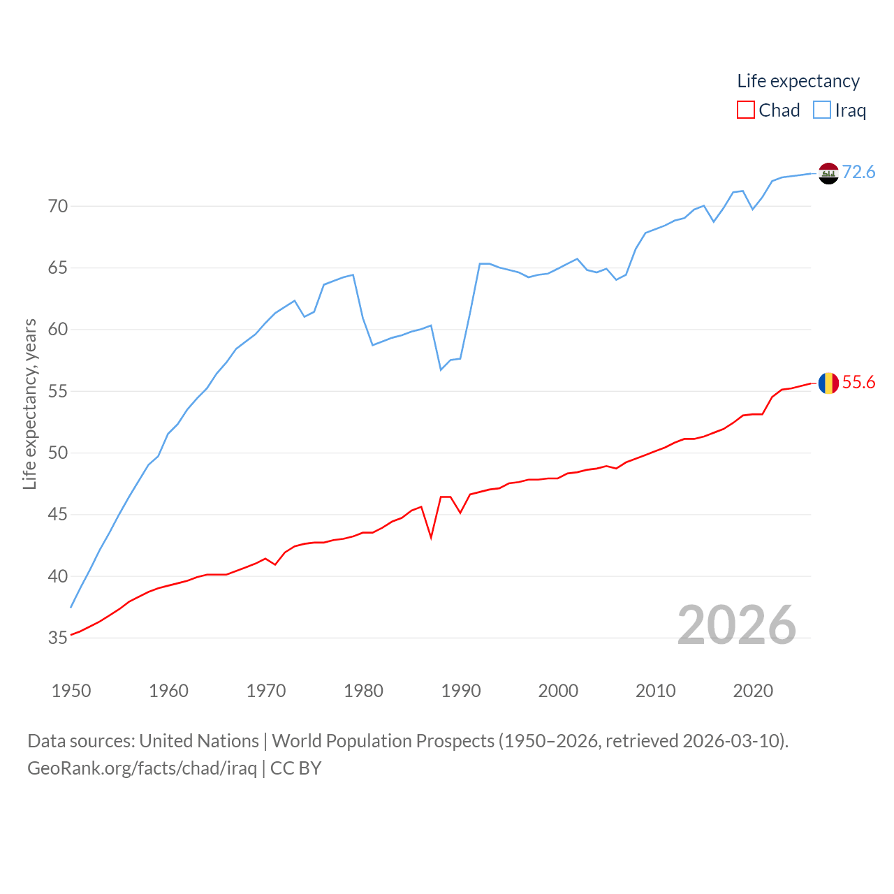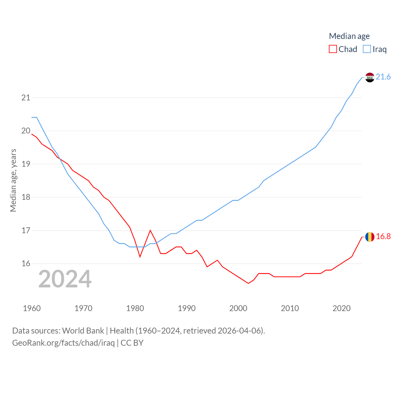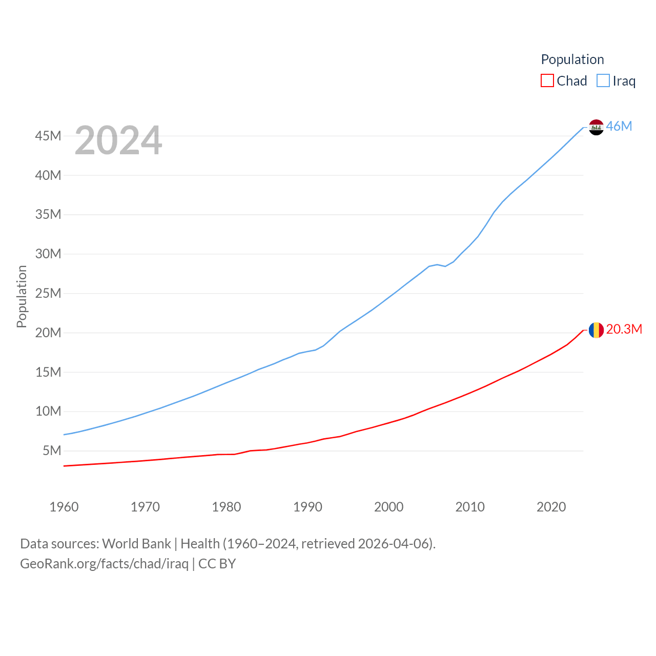 Chad has a population of 20.3M (ranked 65/197), compared with 46M in Iraq (ranked 34/197). Chad's land area is 486,180 sq mi versus 167,619 sq mi for Iraq (ranked 21st vs. 57th).