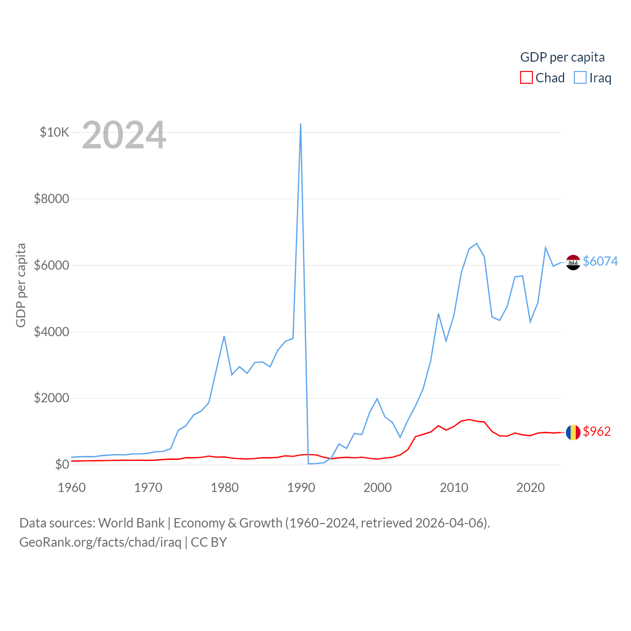 By GDP, Chad ranks 132/197 ($19.5B) and Iraq ranks 50/197 ($280B). By GDP per capita, Chad ranks 182/197 ($962), while Iraq ranks 113/197 ($6,074).