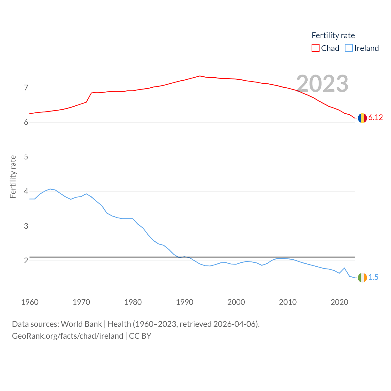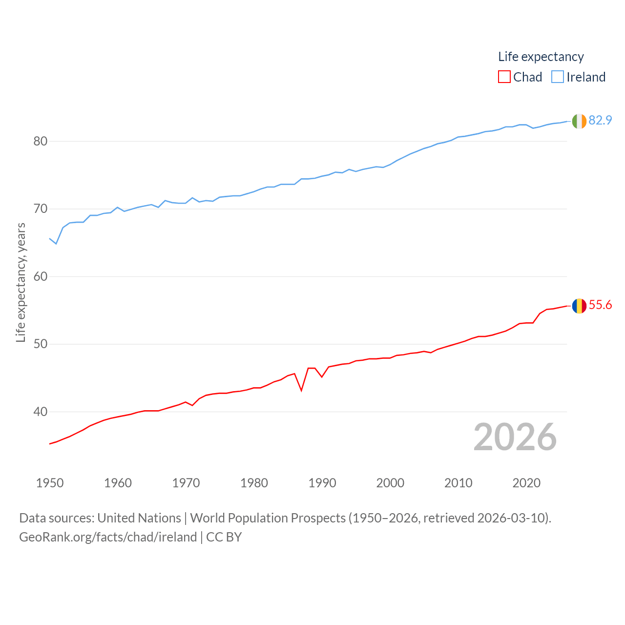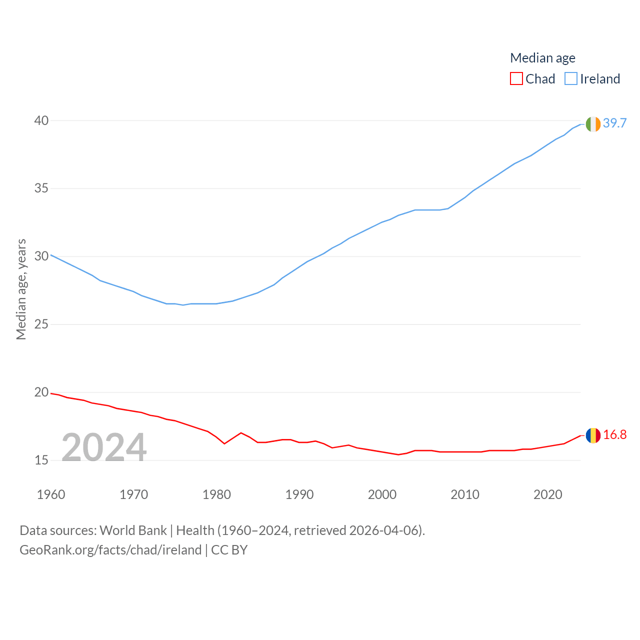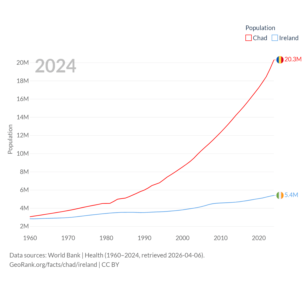 Chad has a population of 20.3M (ranked 65/197), compared with 5.4M in Ireland (ranked 120/197). Chad's land area is 486,180 sq mi versus 26,599 sq mi for Ireland (ranked 21st vs. 119th).