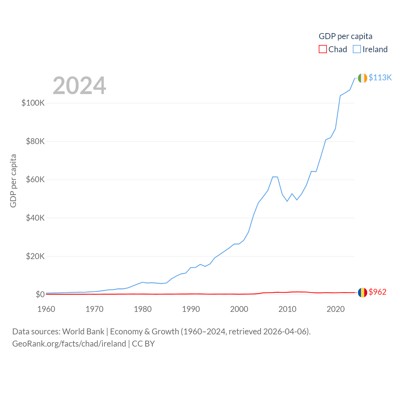 By GDP, Chad ranks 132/197 ($19.5B) and Ireland ranks 25/197 ($609B). By GDP per capita, Chad ranks 182/197 ($962), while Ireland ranks 4/197 ($112,895).