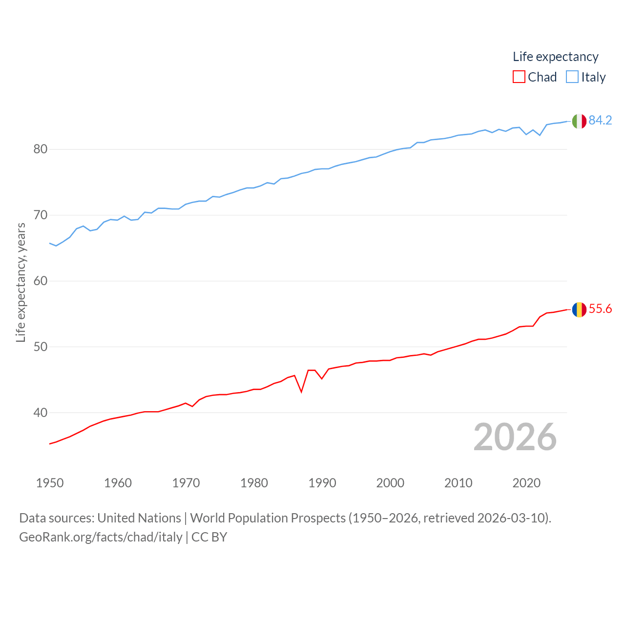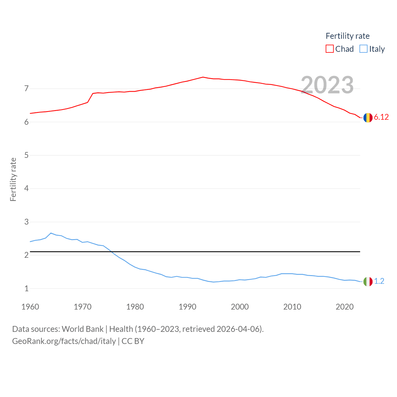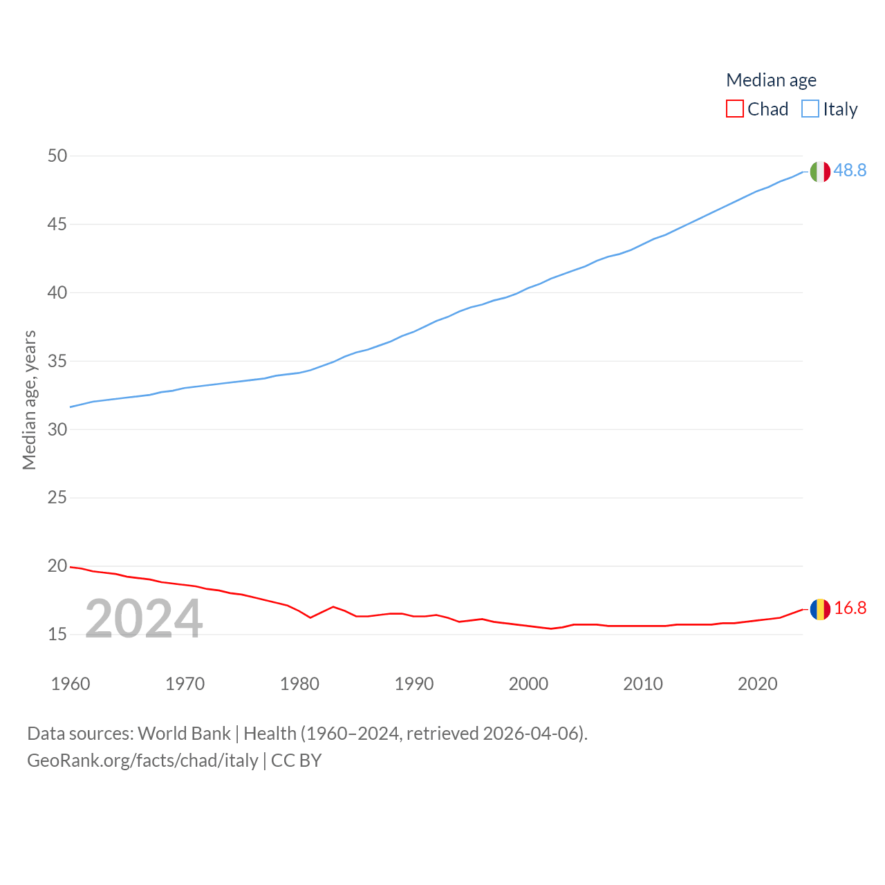Chad has a population of 20.3M (ranked 65/197), compared with 59M in Italy (ranked 25/197). Chad's land area is 486,180 sq mi versus 114,178 sq mi for Italy (ranked 21st vs. 72nd).