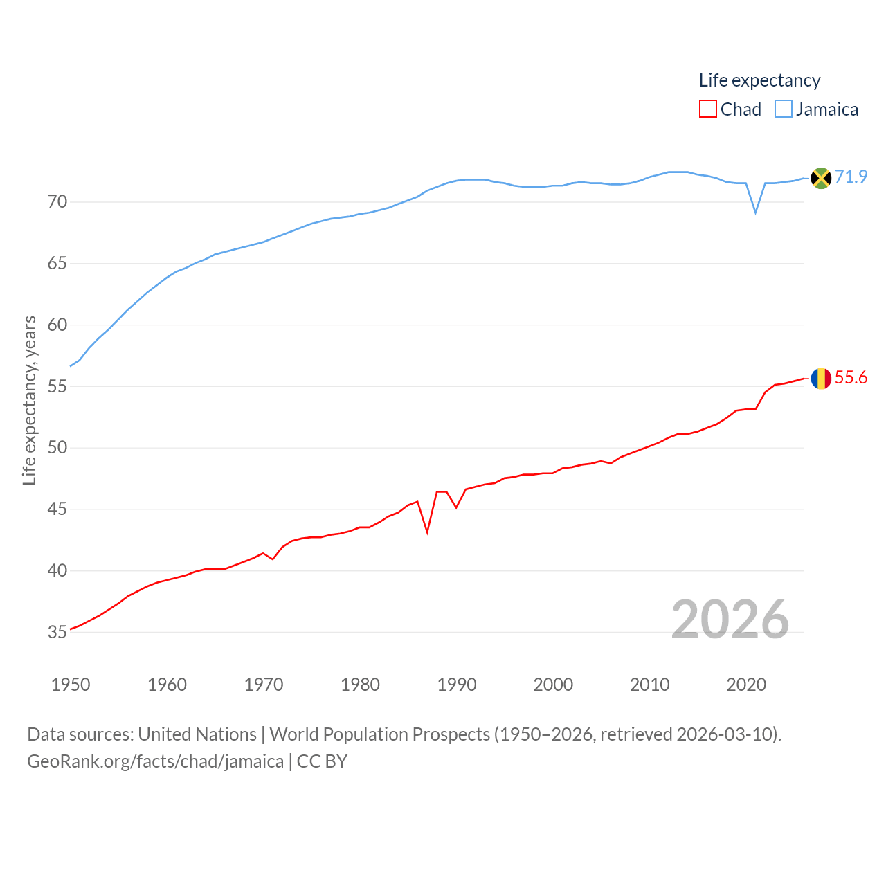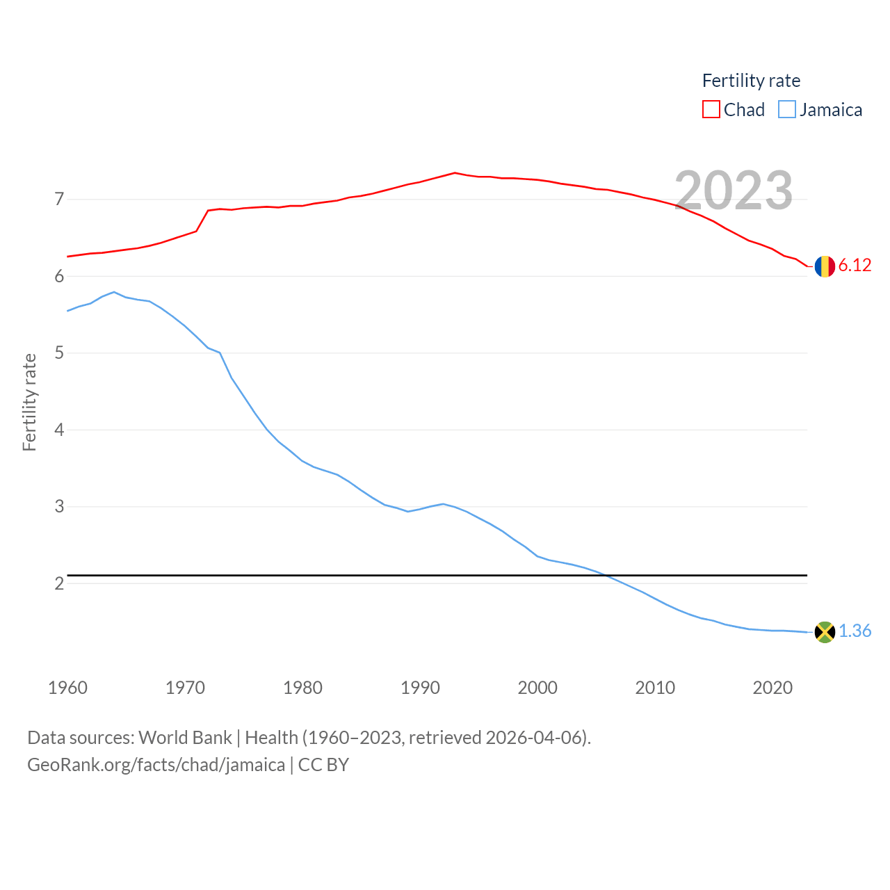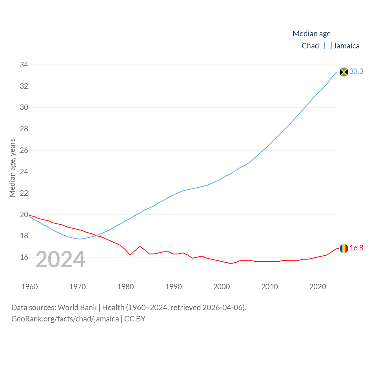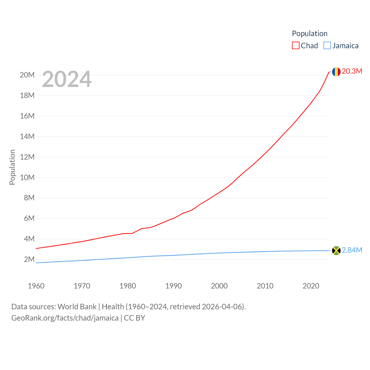 Chad has a population of 20.3M (ranked 65/197), compared with 2.84M in Jamaica (ranked 139/197). Chad's land area is 486,180 sq mi versus 4,181 sq mi for Jamaica (ranked 21st vs. 159th).