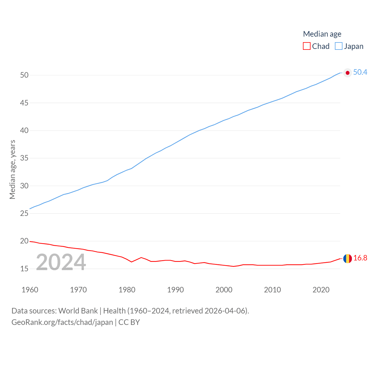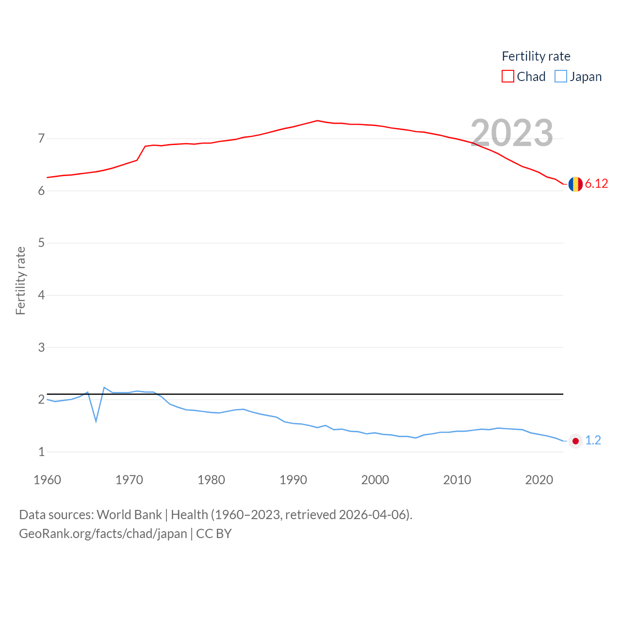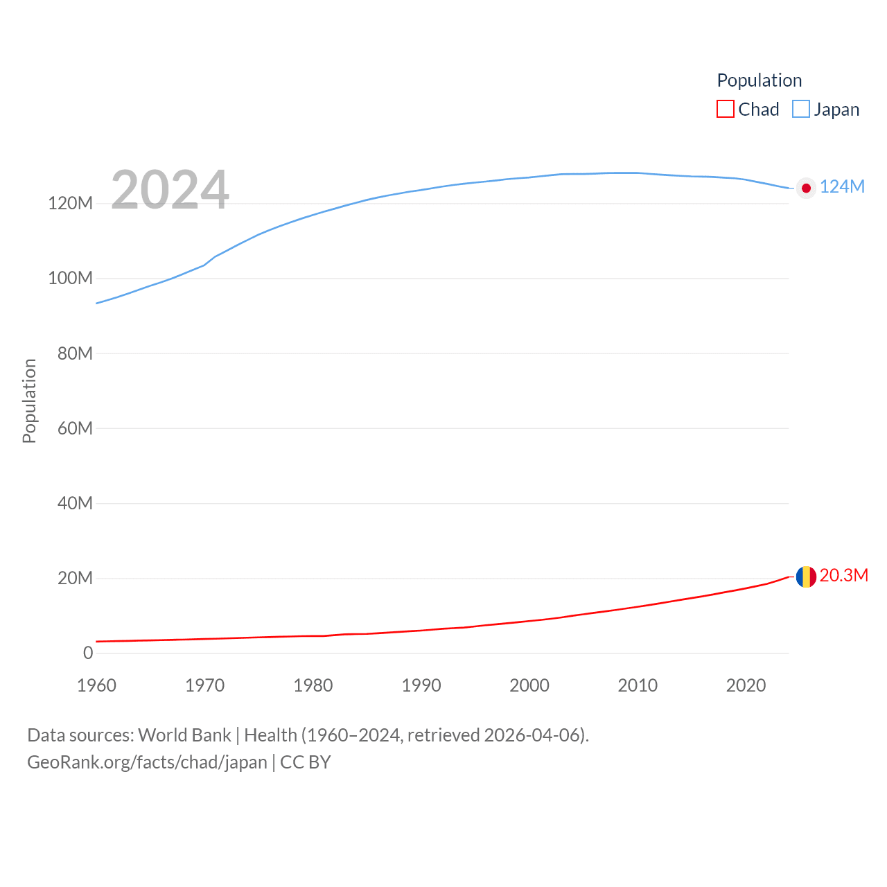 Chad has a population of 20.3M (ranked 65/197), compared with 124M in Japan (ranked 12/197). Chad's land area is 486,180 sq mi versus 140,761 sq mi for Japan (ranked 21st vs. 61st).
