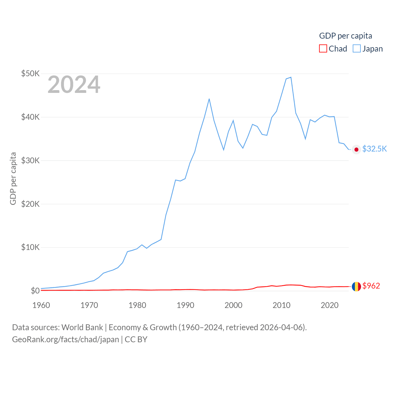 By GDP, Chad ranks 132/197 ($19.5B) and Japan ranks 4/197 ($4.03T). By GDP per capita, Chad ranks 182/197 ($962), while Japan ranks 38/197 ($32,487).