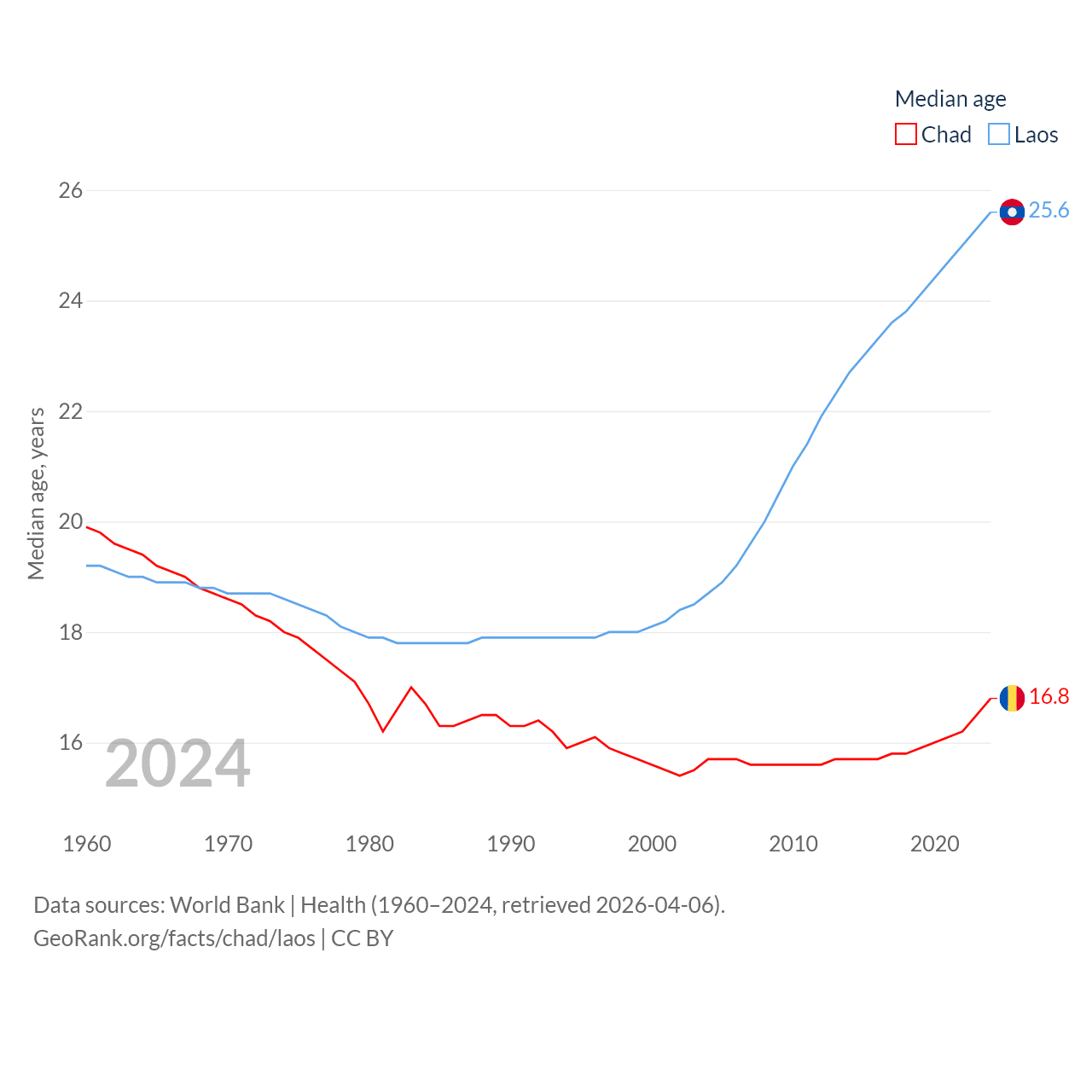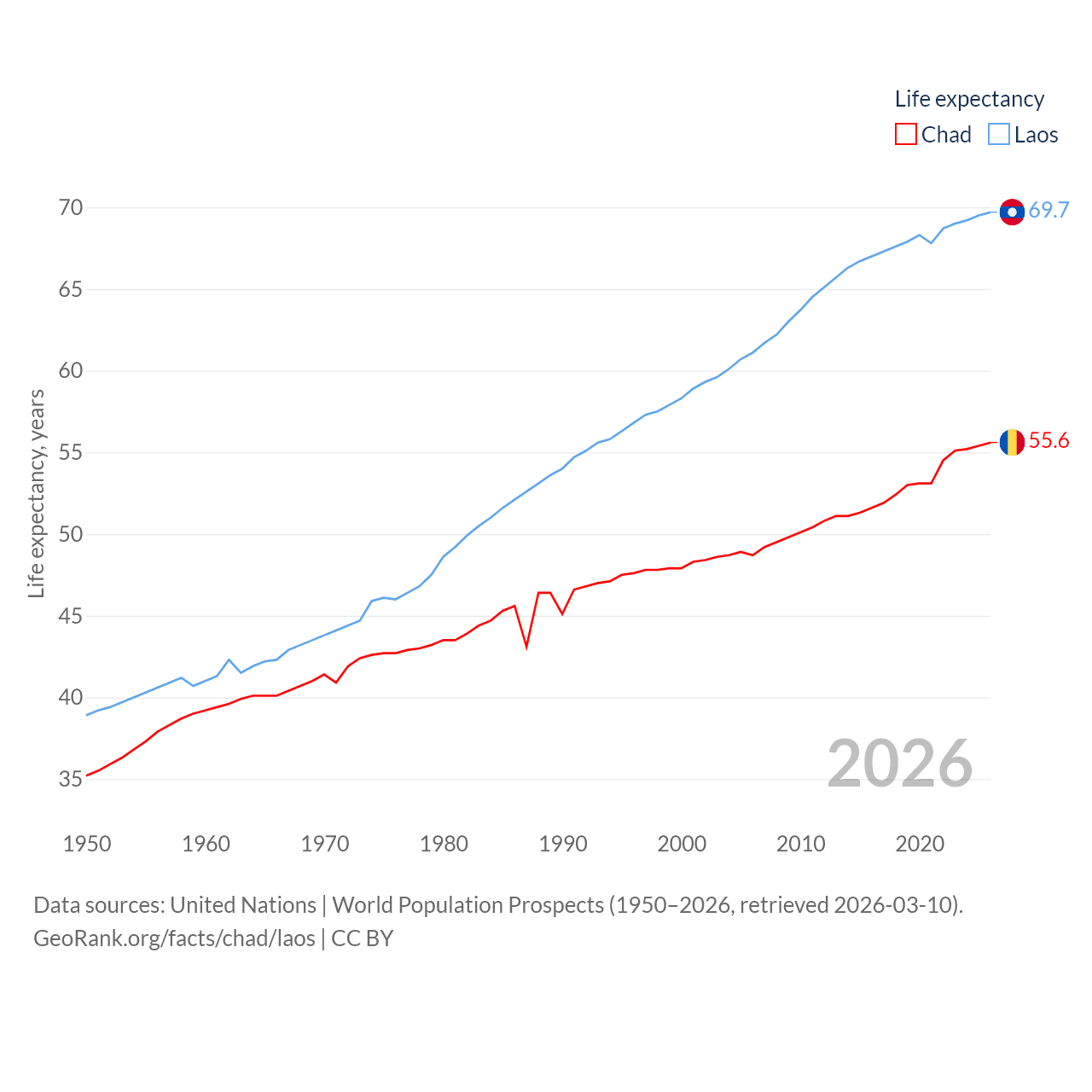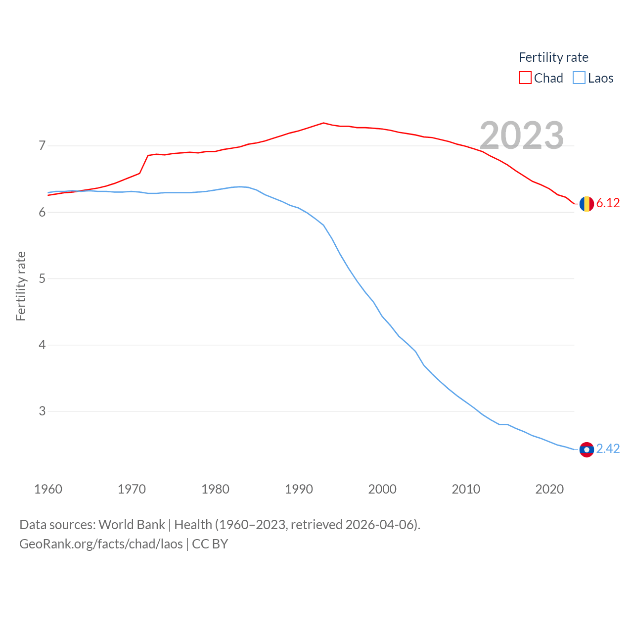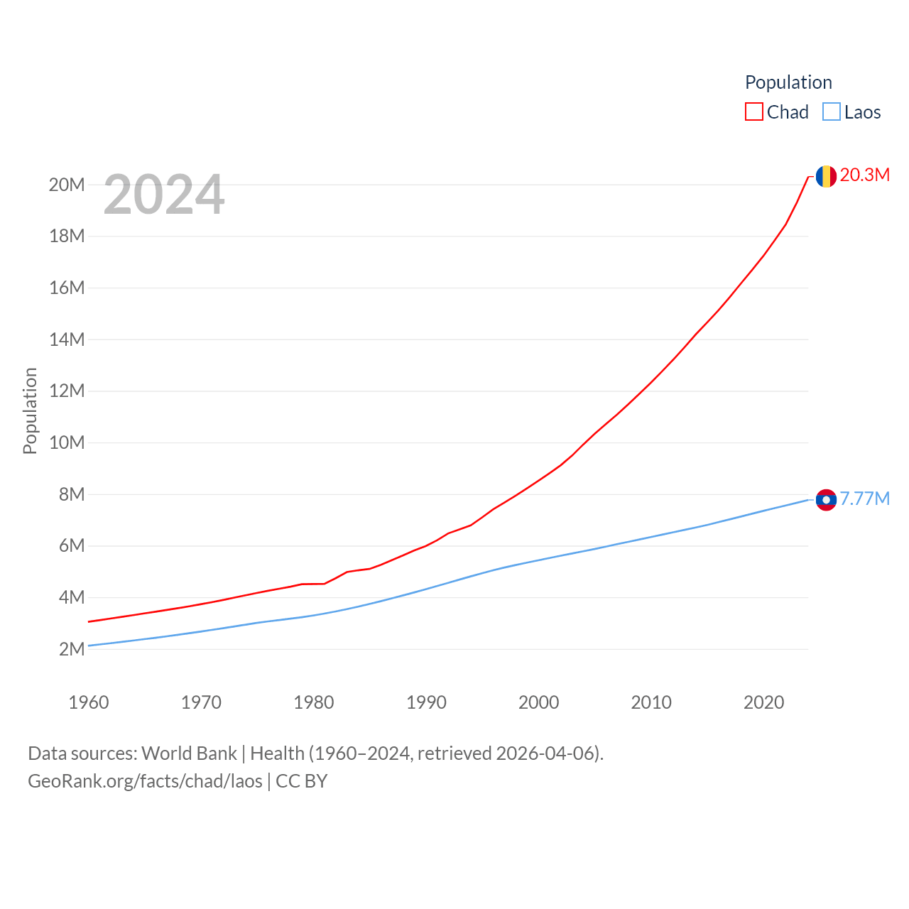 Chad has a population of 20.3M (ranked 65/197), compared with 7.77M in Laos (ranked 103/197). Chad's land area is 486,180 sq mi versus 89,112 sq mi for Laos (ranked 21st vs. 79th).