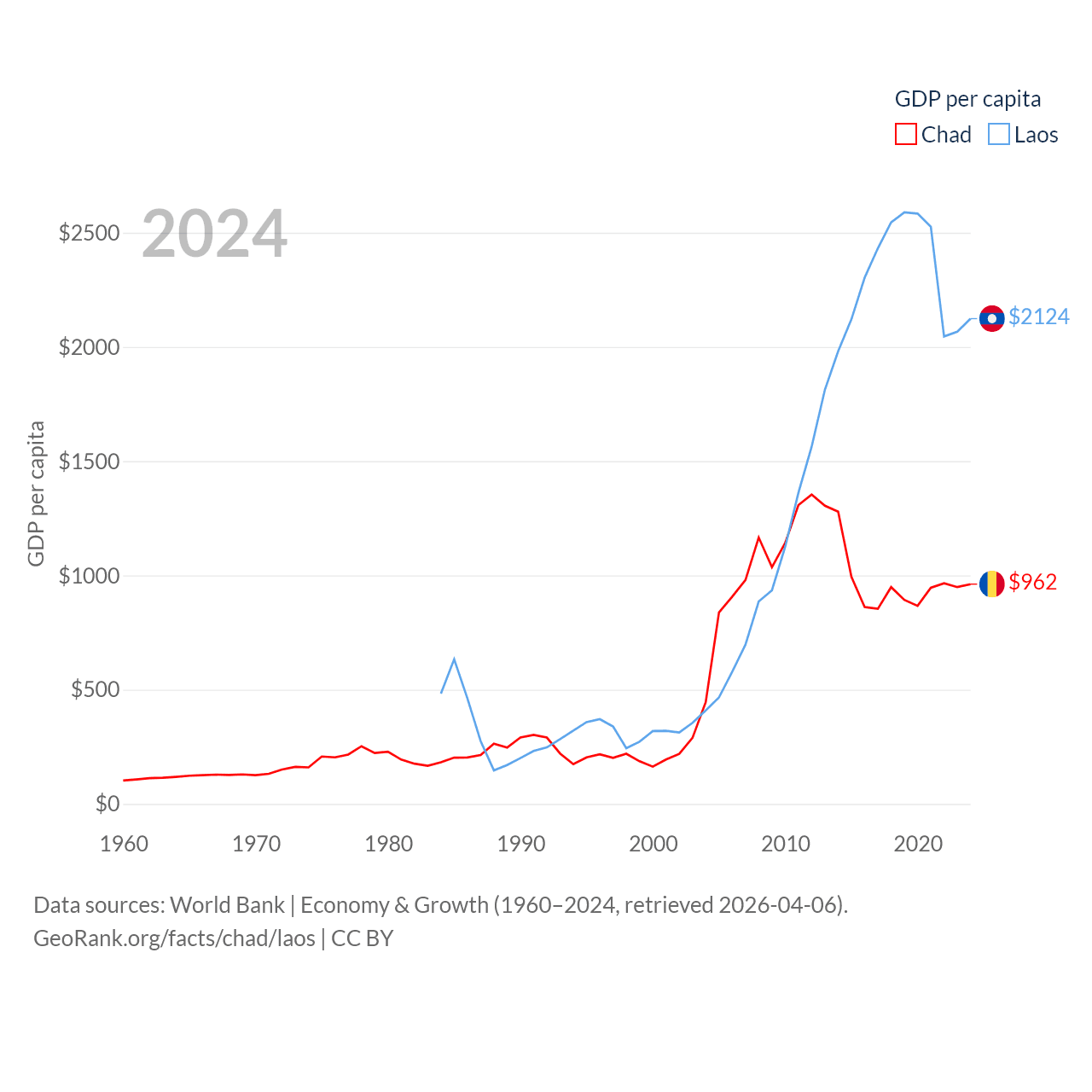 By GDP, Chad ranks 132/197 ($19.5B) and Laos ranks 139/197 ($16.5B). By GDP per capita, Chad ranks 182/197 ($962), while Laos ranks 155/197 ($2,124).