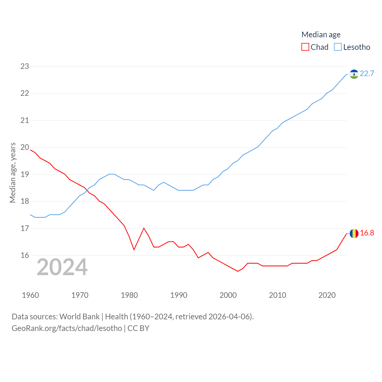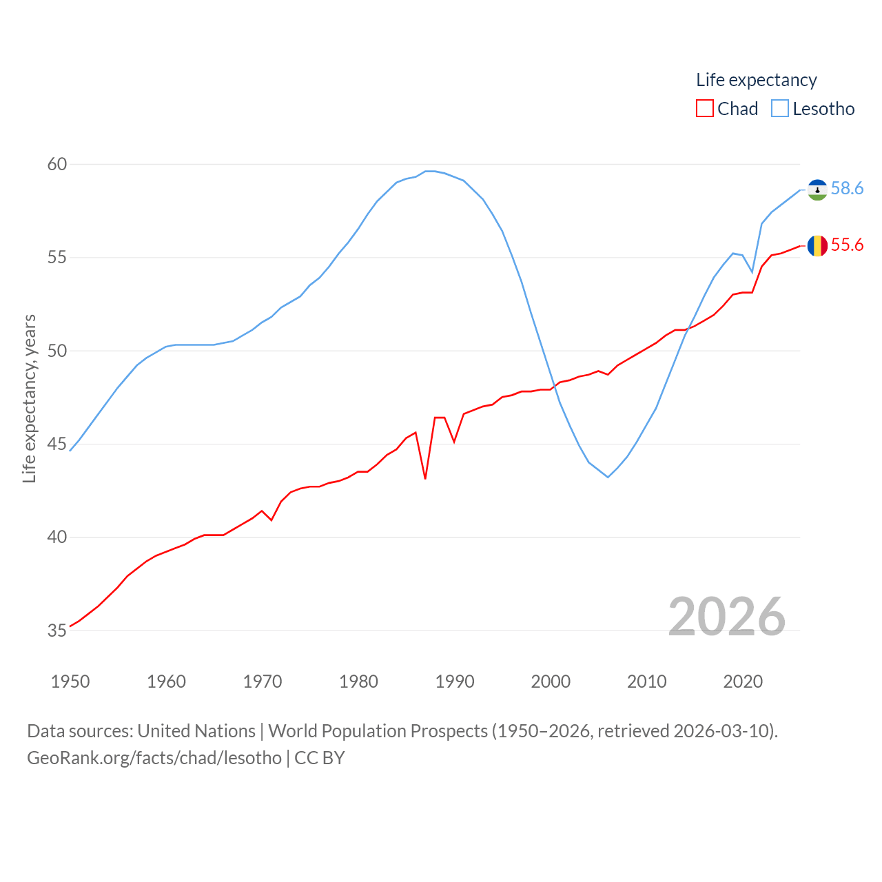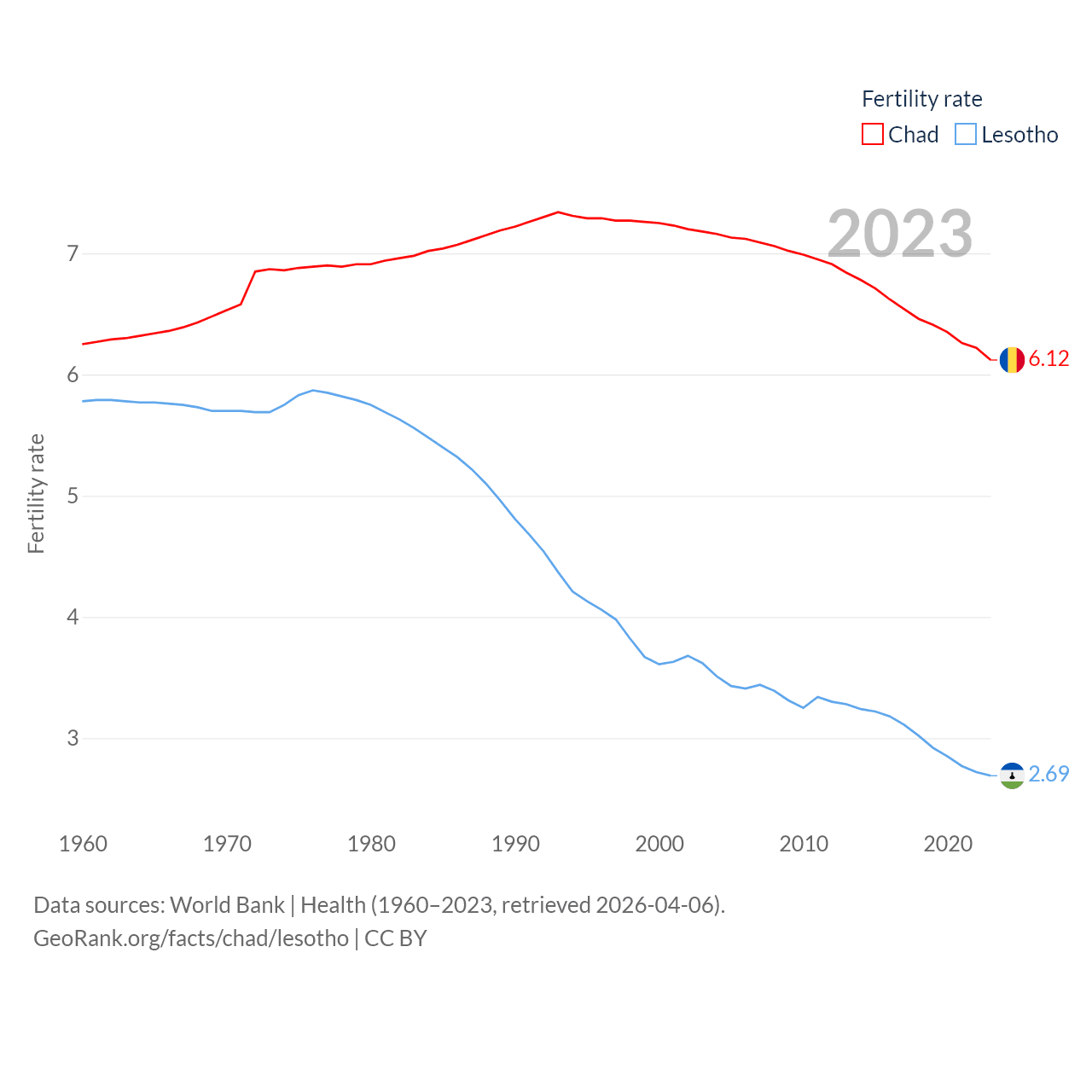 Chad has a population of 20.3M (ranked 65/197), compared with 2.34M in Lesotho (ranked 145/197). Chad's land area is 486,180 sq mi versus 11,722 sq mi for Lesotho (ranked 21st vs. 137th).