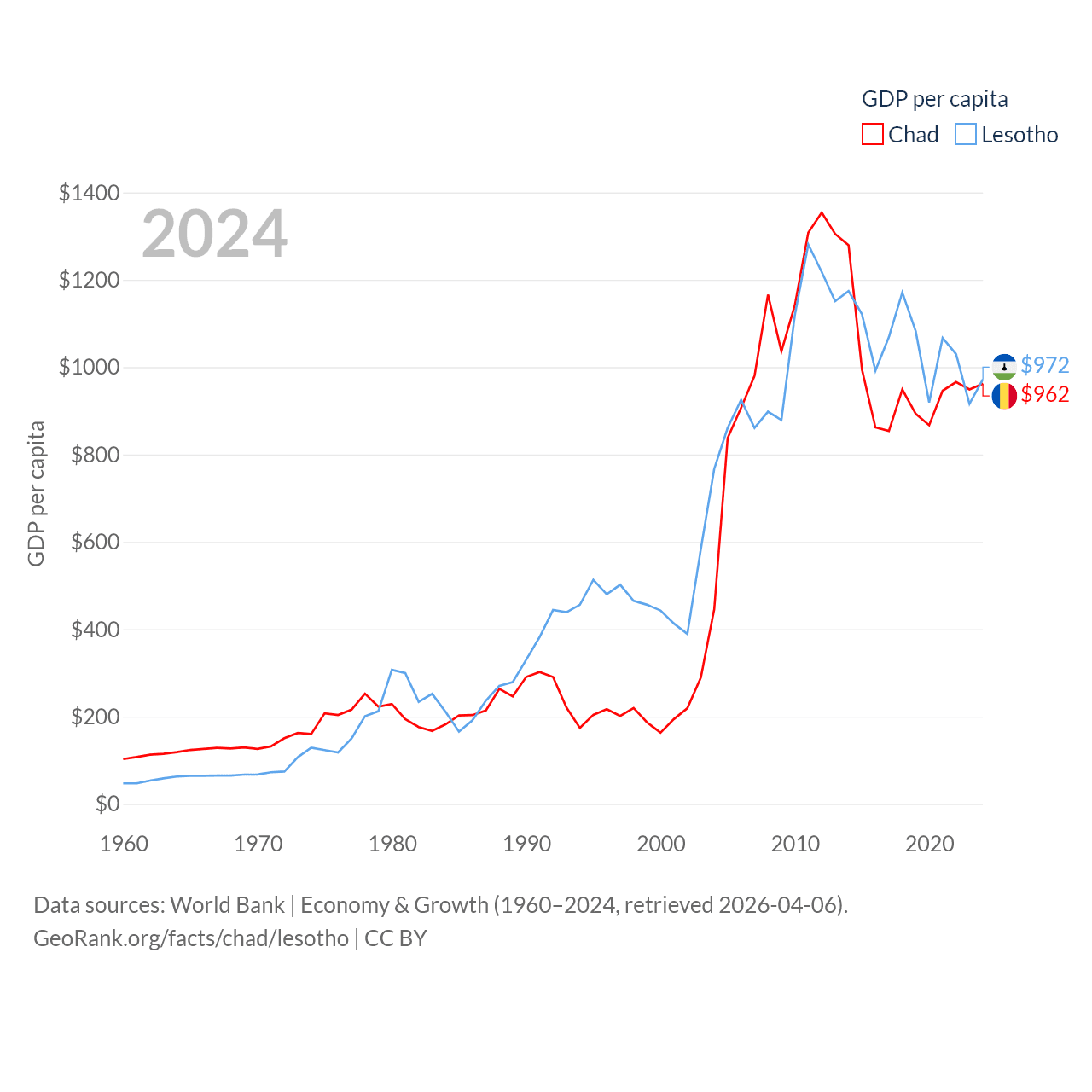 By GDP, Chad ranks 132/197 ($19.5B) and Lesotho ranks 175/197 ($2.27B). By GDP per capita, Chad ranks 182/197 ($962), while Lesotho ranks 181/197 ($972).