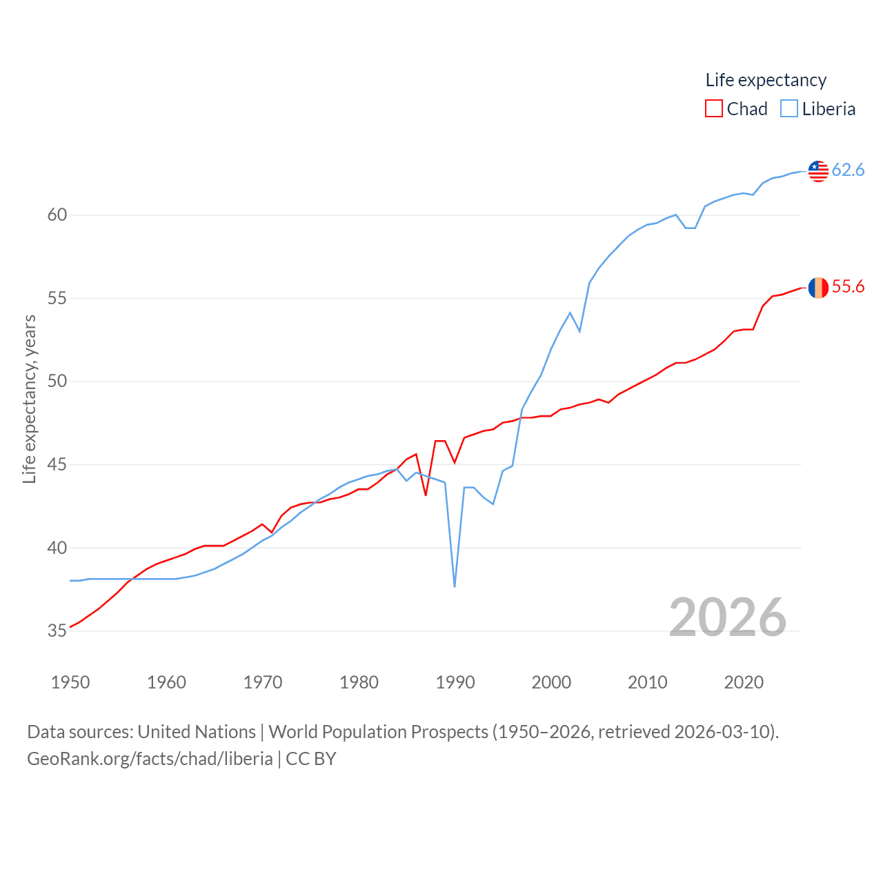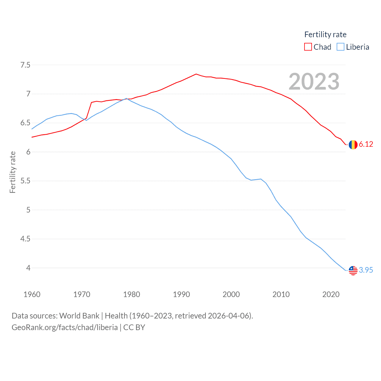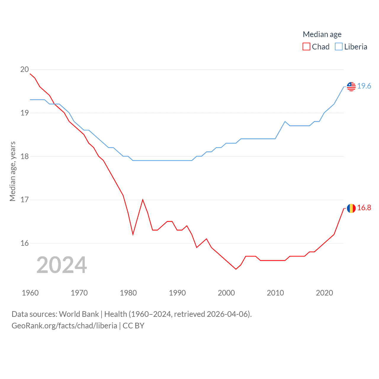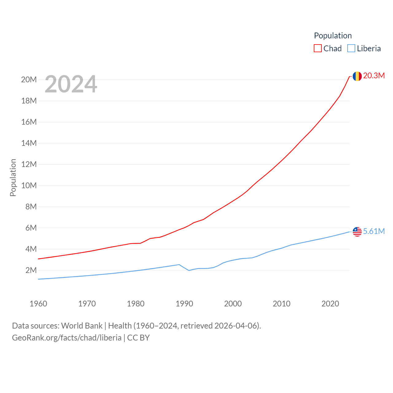 Chad has a population of 20.3M (ranked 65/197), compared with 5.61M in Liberia (ranked 117/197). Chad's land area is 486,180 sq mi versus 37,189 sq mi for Liberia (ranked 21st vs. 106th).