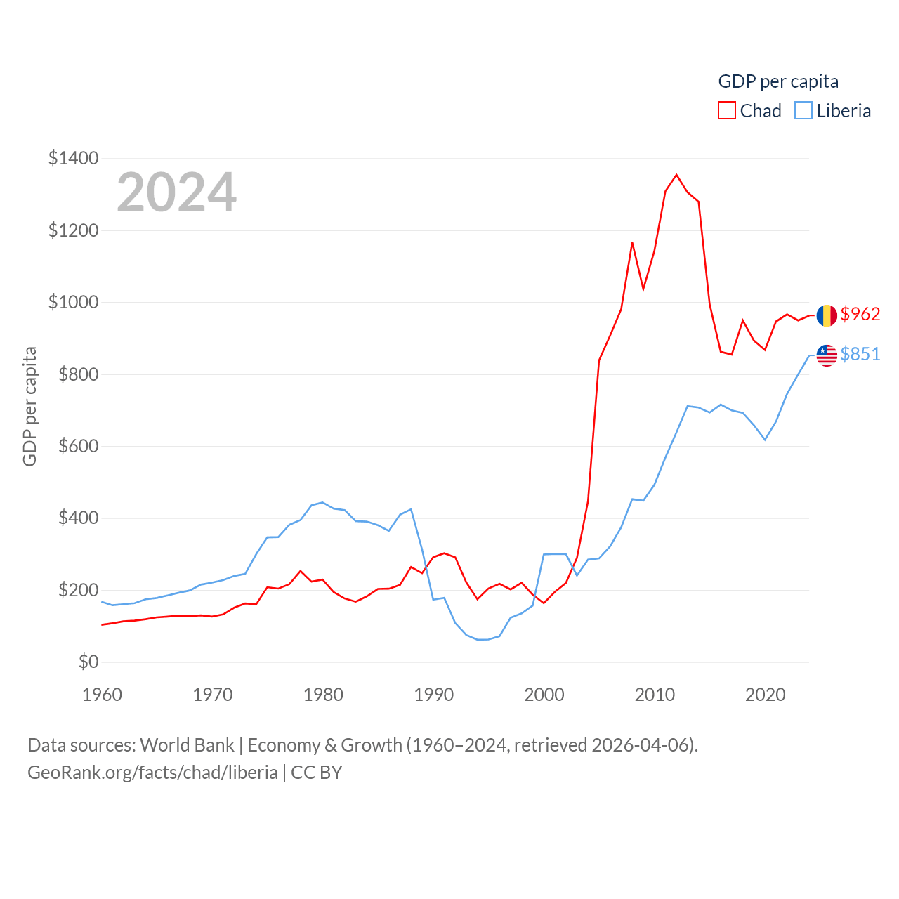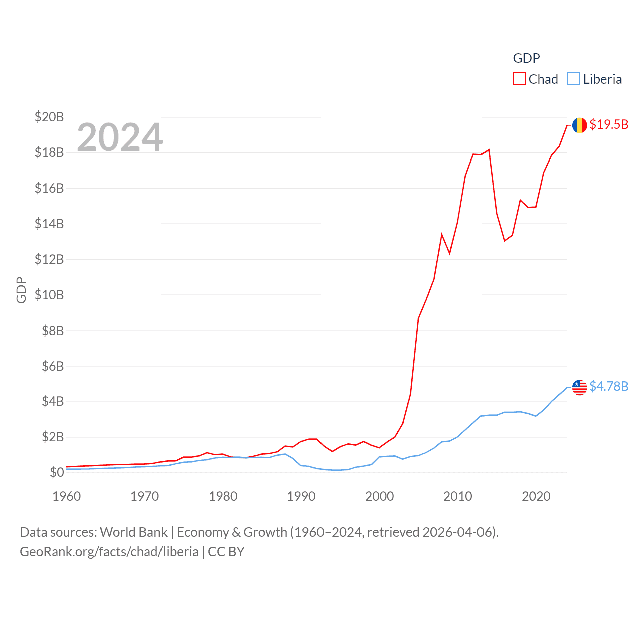 By GDP, Chad ranks 132/197 ($19.5B) and Liberia ranks 163/197 ($4.78B). By GDP per capita, Chad ranks 182/197 ($962), while Liberia ranks 184/197 ($851).