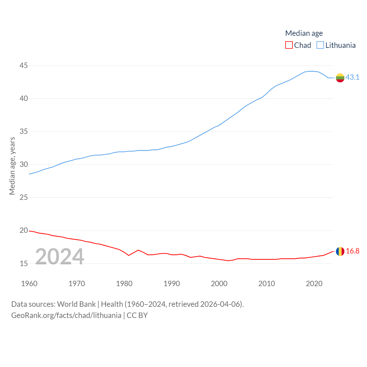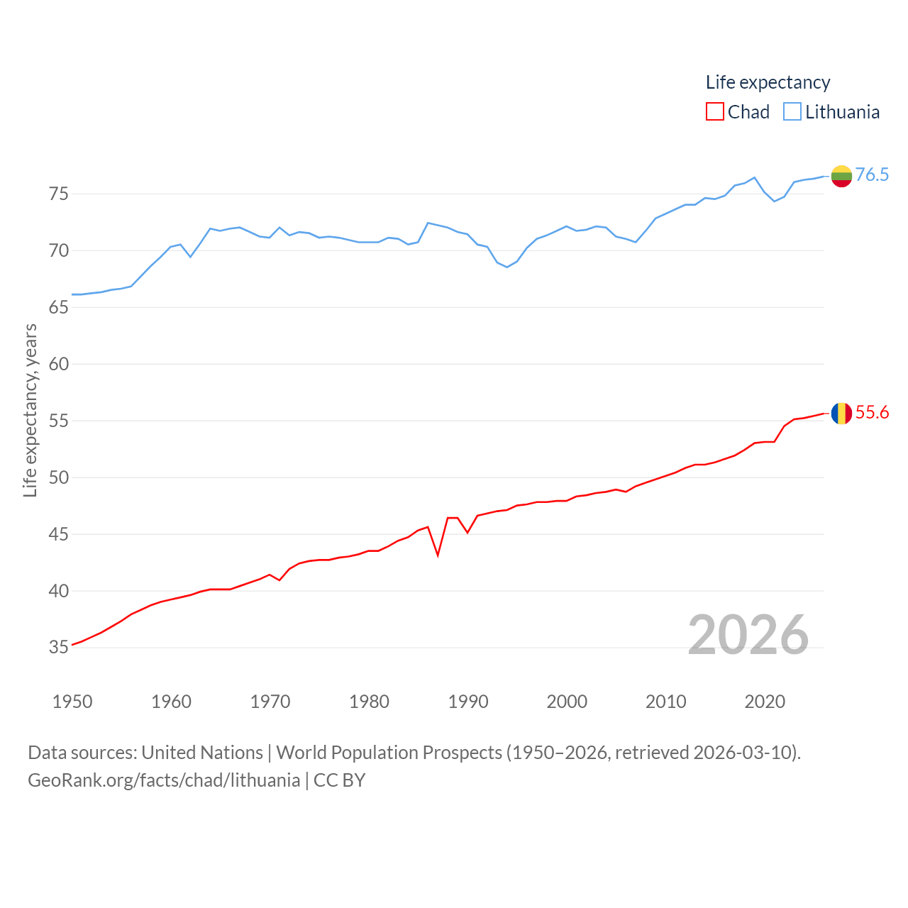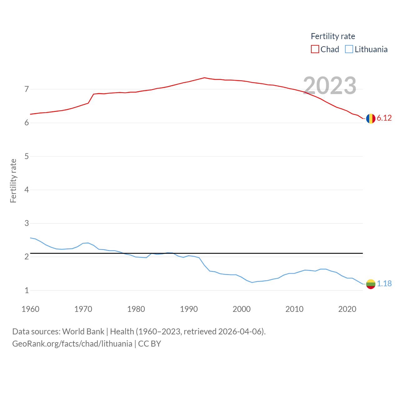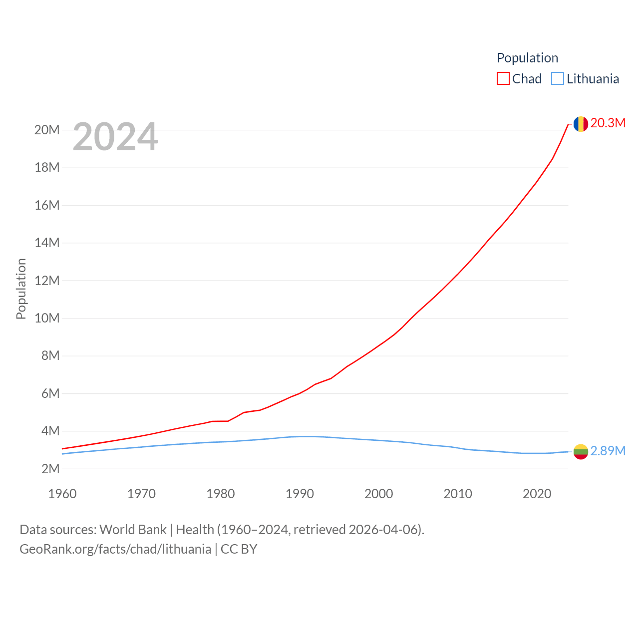 Chad has a population of 20.3M (ranked 65/197), compared with 2.89M in Lithuania (ranked 137/197). Chad's land area is 486,180 sq mi versus 24,170 sq mi for Lithuania (ranked 21st vs. 120th).