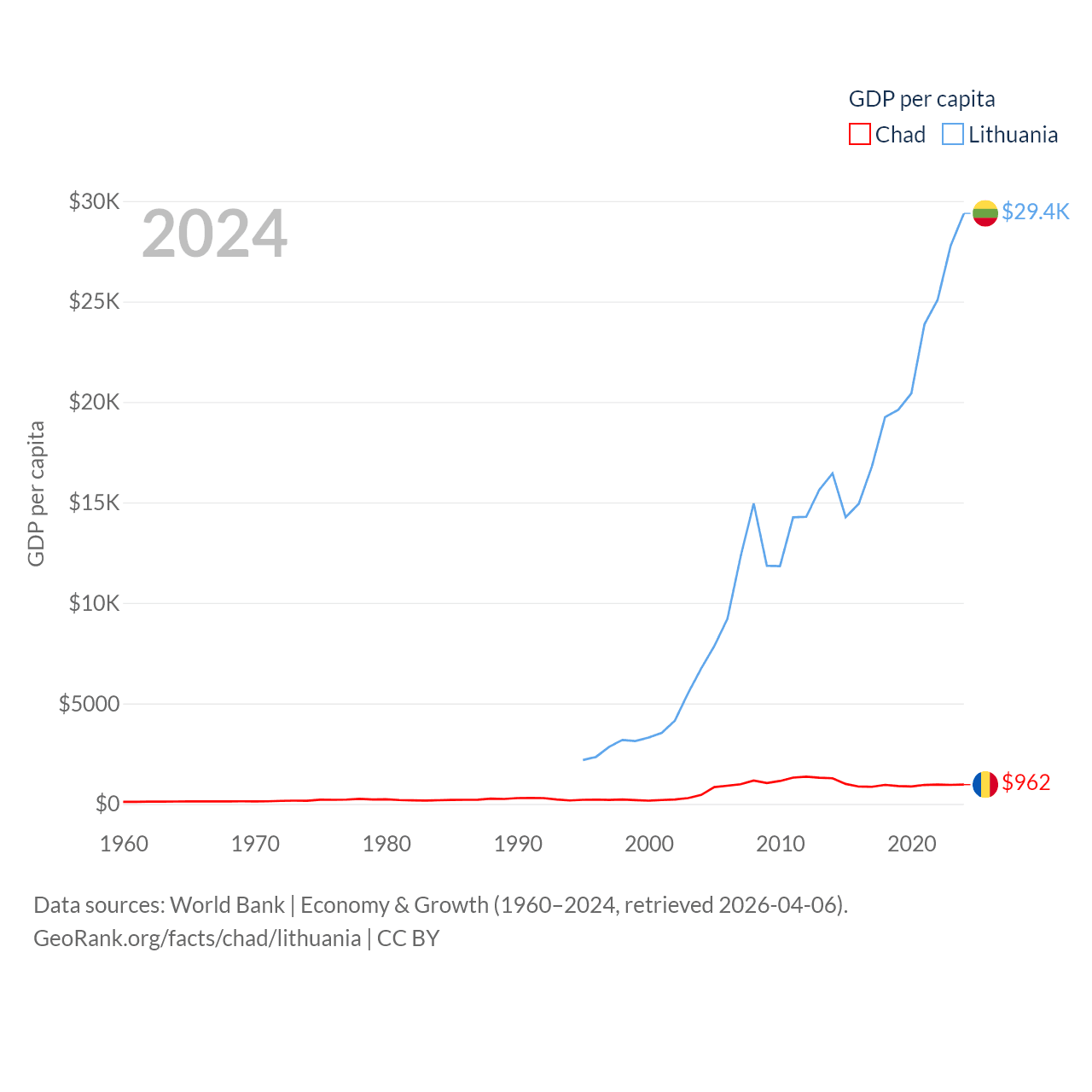 By GDP, Chad ranks 132/197 ($19.5B) and Lithuania ranks 79/197 ($84.9B). By GDP per capita, Chad ranks 182/197 ($962), while Lithuania ranks 43/197 ($29,384).