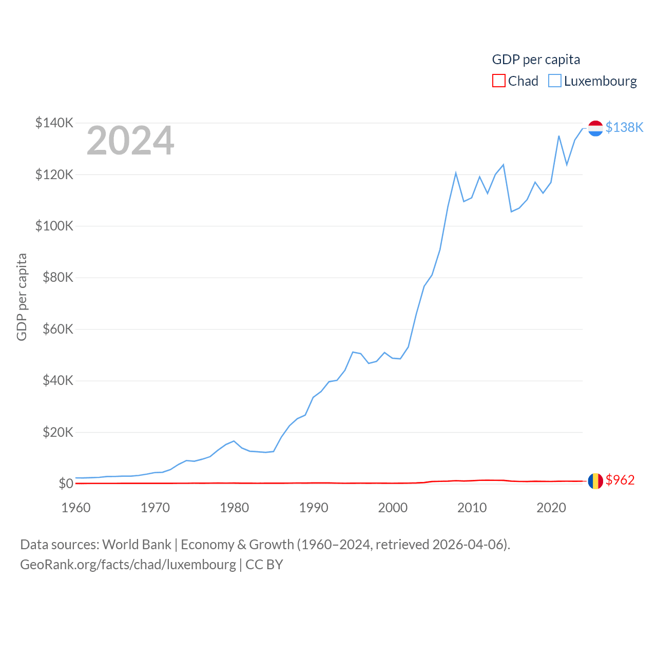 By GDP, Chad ranks 132/197 ($19.5B) and Luxembourg ranks 74/197 ($93.3B). By GDP per capita, Chad ranks 182/197 ($962), while Luxembourg ranks 3/197 ($137,782).