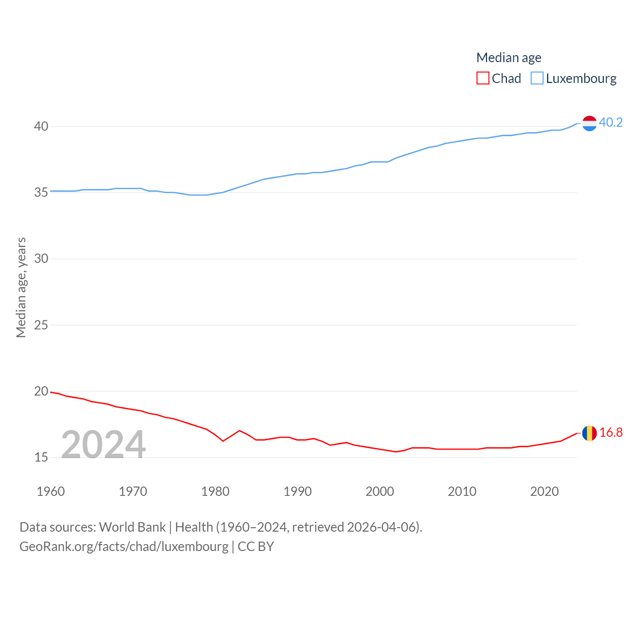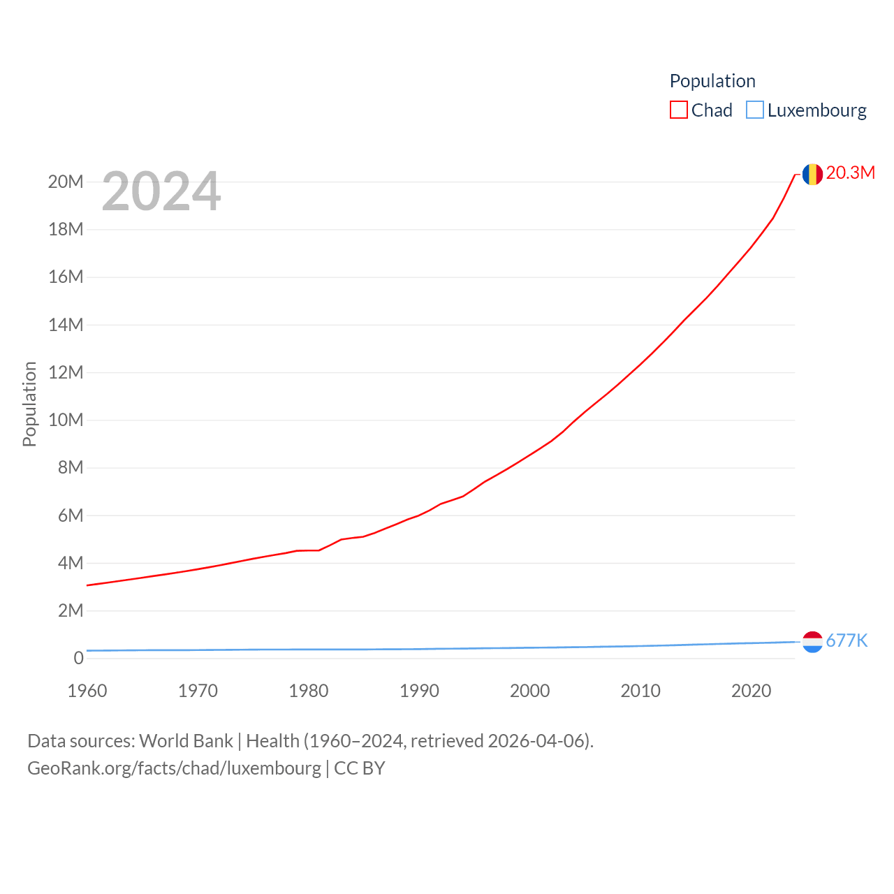 Chad has a population of 20.3M (ranked 65/197), compared with 677K in Luxembourg (ranked 164/197). Chad's land area is 486,180 sq mi versus 994 sq mi for Luxembourg (ranked 21st vs. 169th).