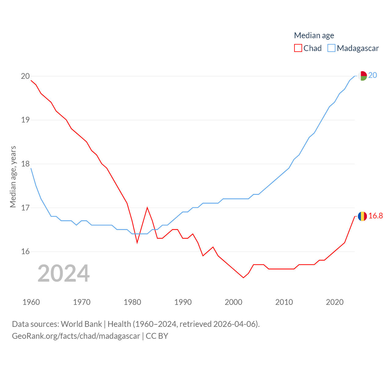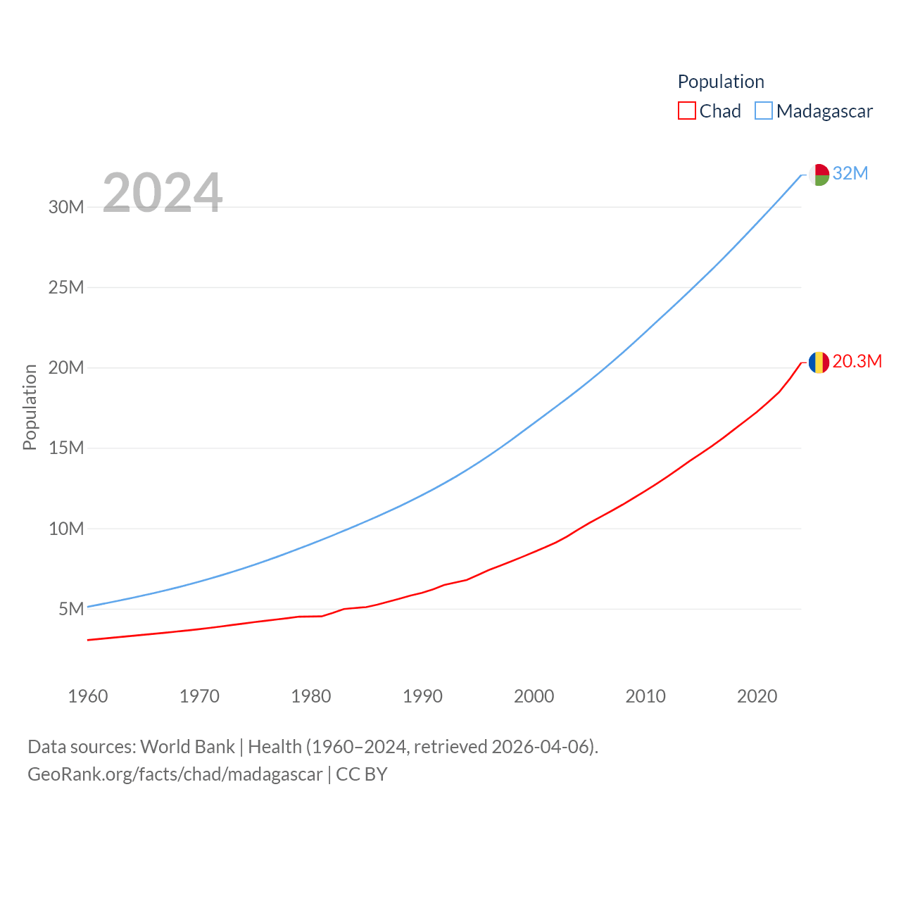 Chad has a population of 20.3M (ranked 65/197), compared with 32M in Madagascar (ranked 49/197). Chad's land area is 486,180 sq mi versus 224,634 sq mi for Madagascar (ranked 21st vs. 44th).