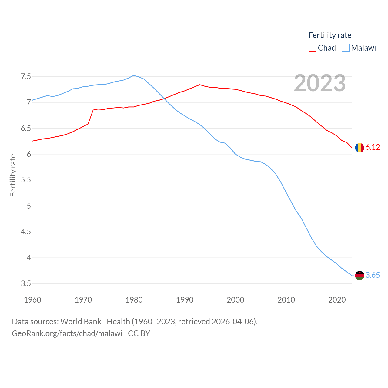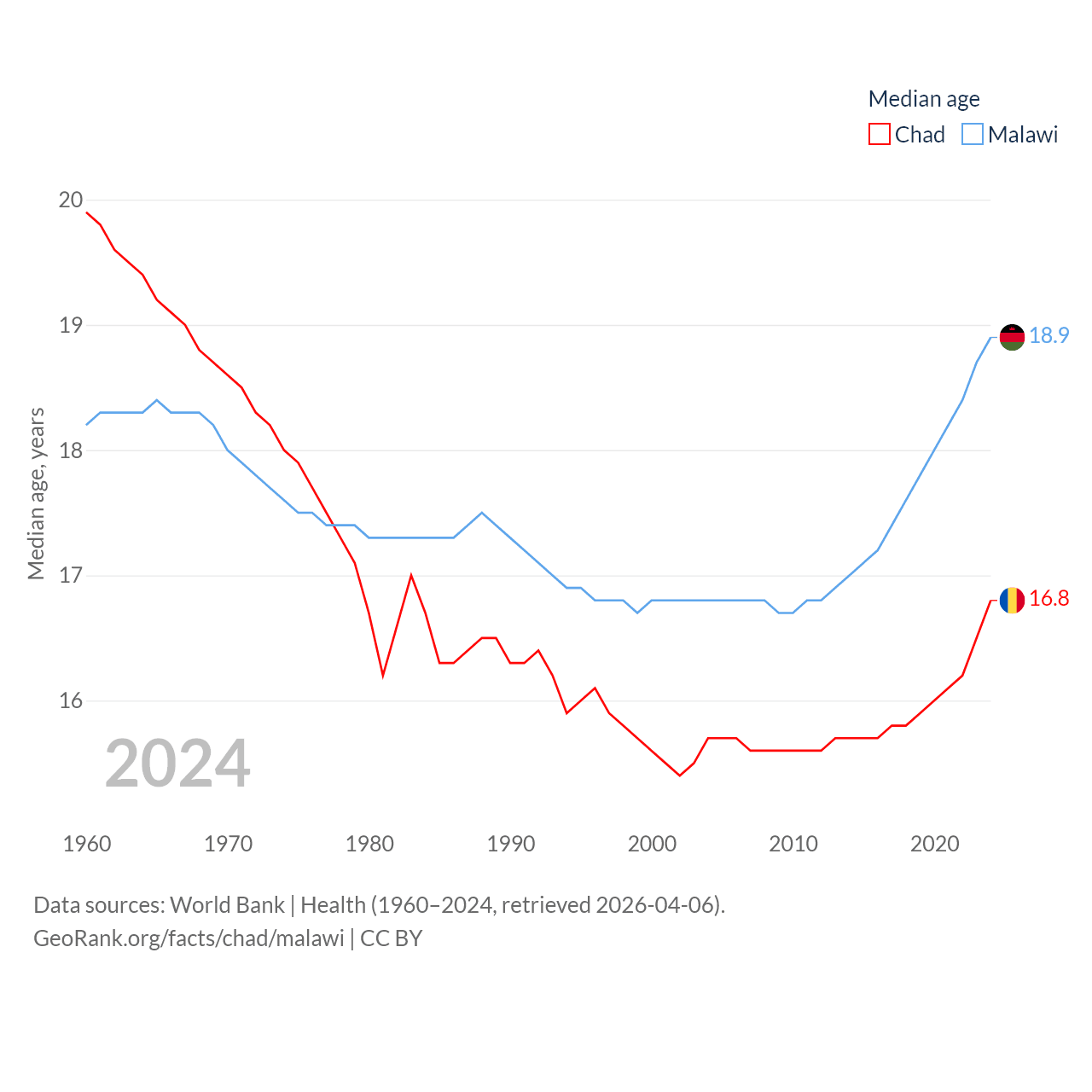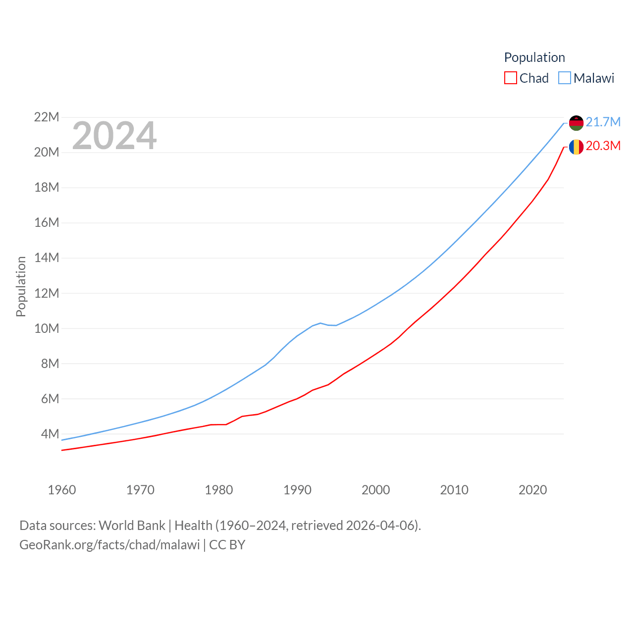 Chad has a population of 20.3M (ranked 65/197), compared with 21.7M in Malawi (ranked 62/197). Chad's land area is 486,180 sq mi versus 36,402 sq mi for Malawi (ranked 21st vs. 107th).