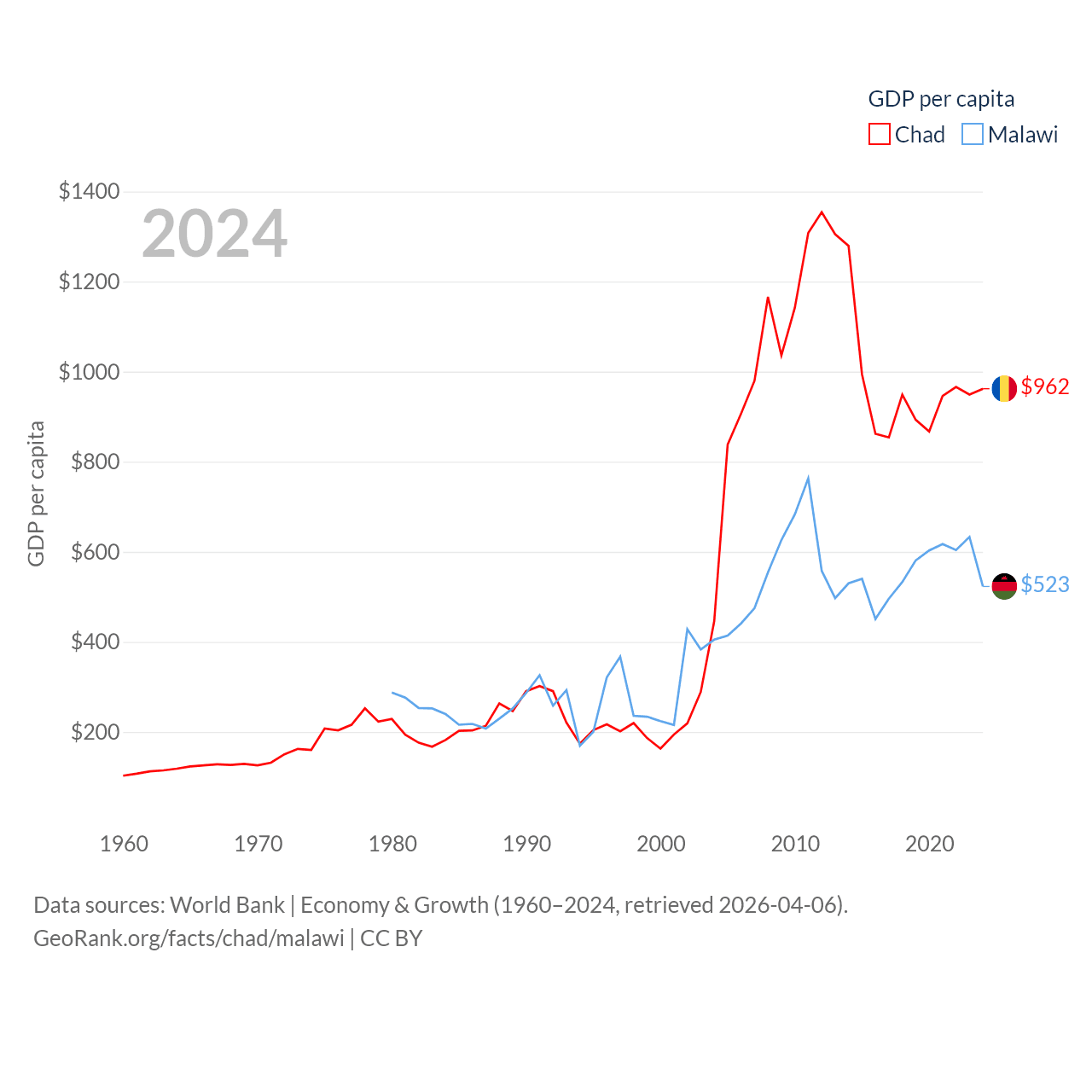 By GDP, Chad ranks 132/197 ($19.5B) and Malawi ranks 151/197 ($11.3B). By GDP per capita, Chad ranks 182/197 ($962), while Malawi ranks 194/197 ($523).