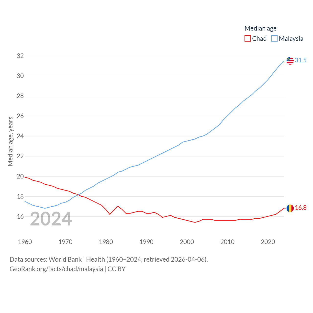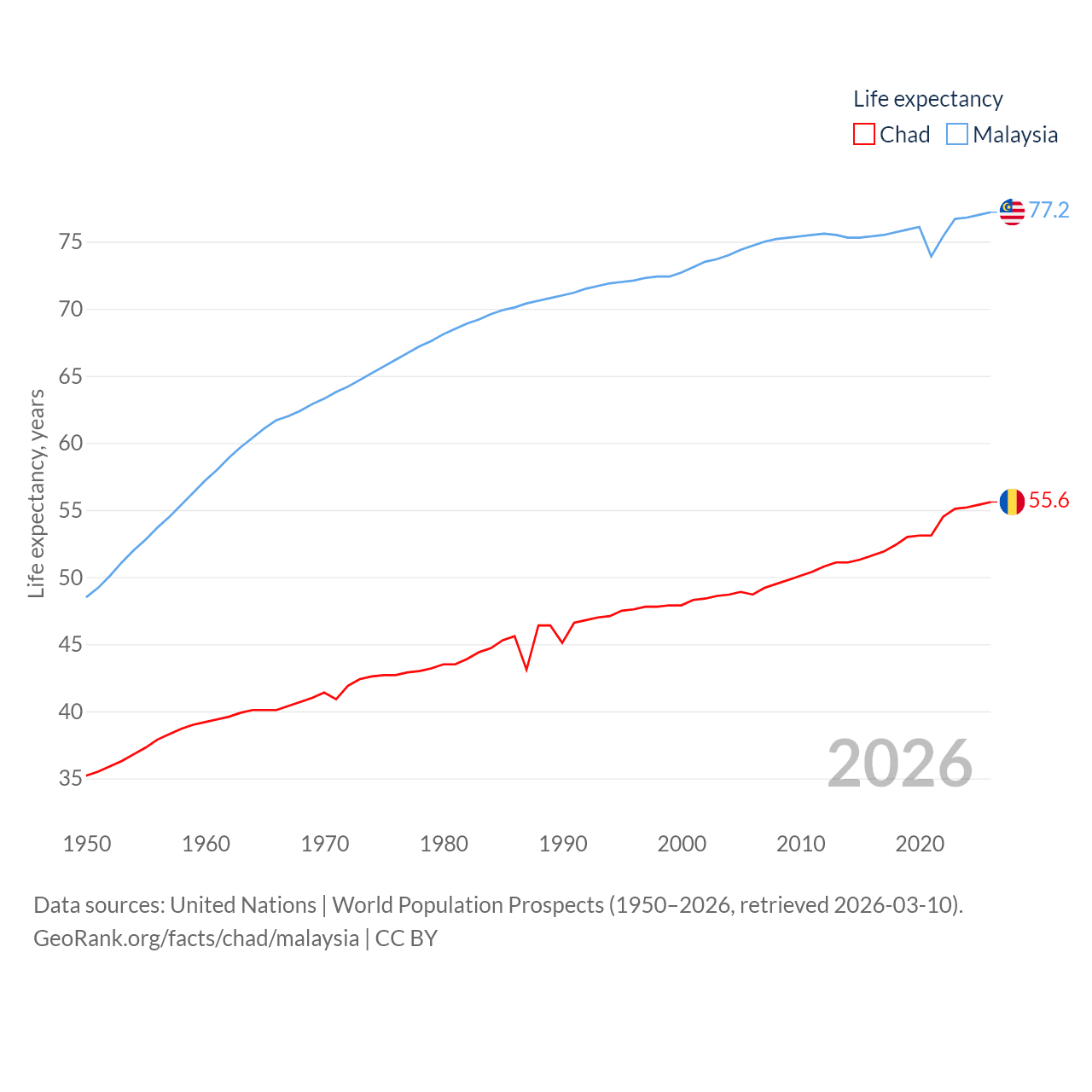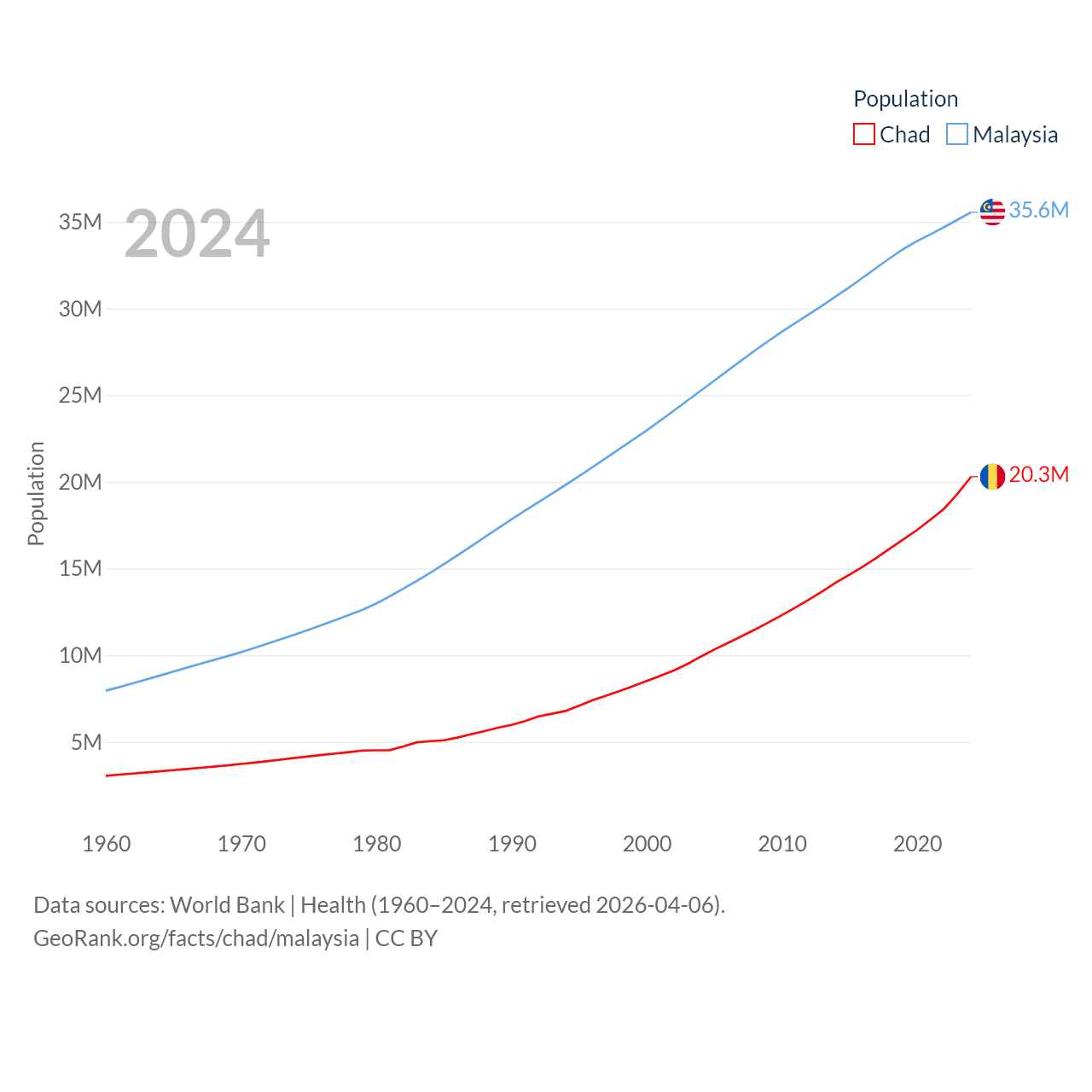 Chad has a population of 20.3M (ranked 65/197), compared with 35.6M in Malaysia (ranked 44/197). Chad's land area is 486,180 sq mi versus 126,854 sq mi for Malaysia (ranked 21st vs. 65th).