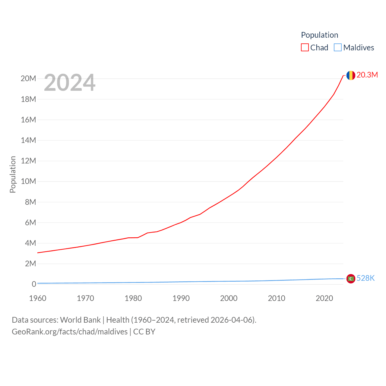Chad has a population of 20.3M (ranked 65/197), compared with 528K in Maldives (ranked 168/197). Chad's land area is 486,180 sq mi versus 115.1 sq mi for Maldives (ranked 21st vs. 188th).