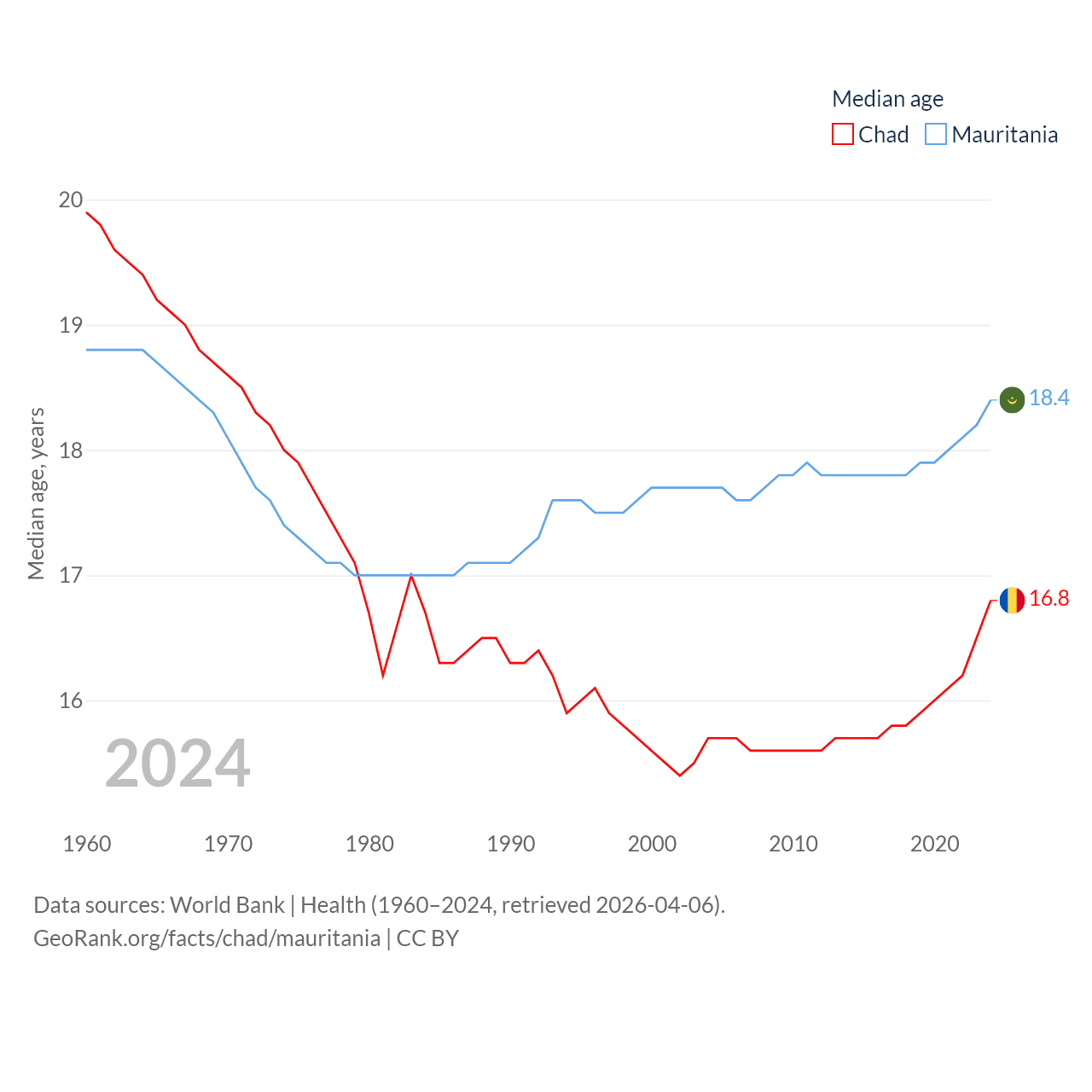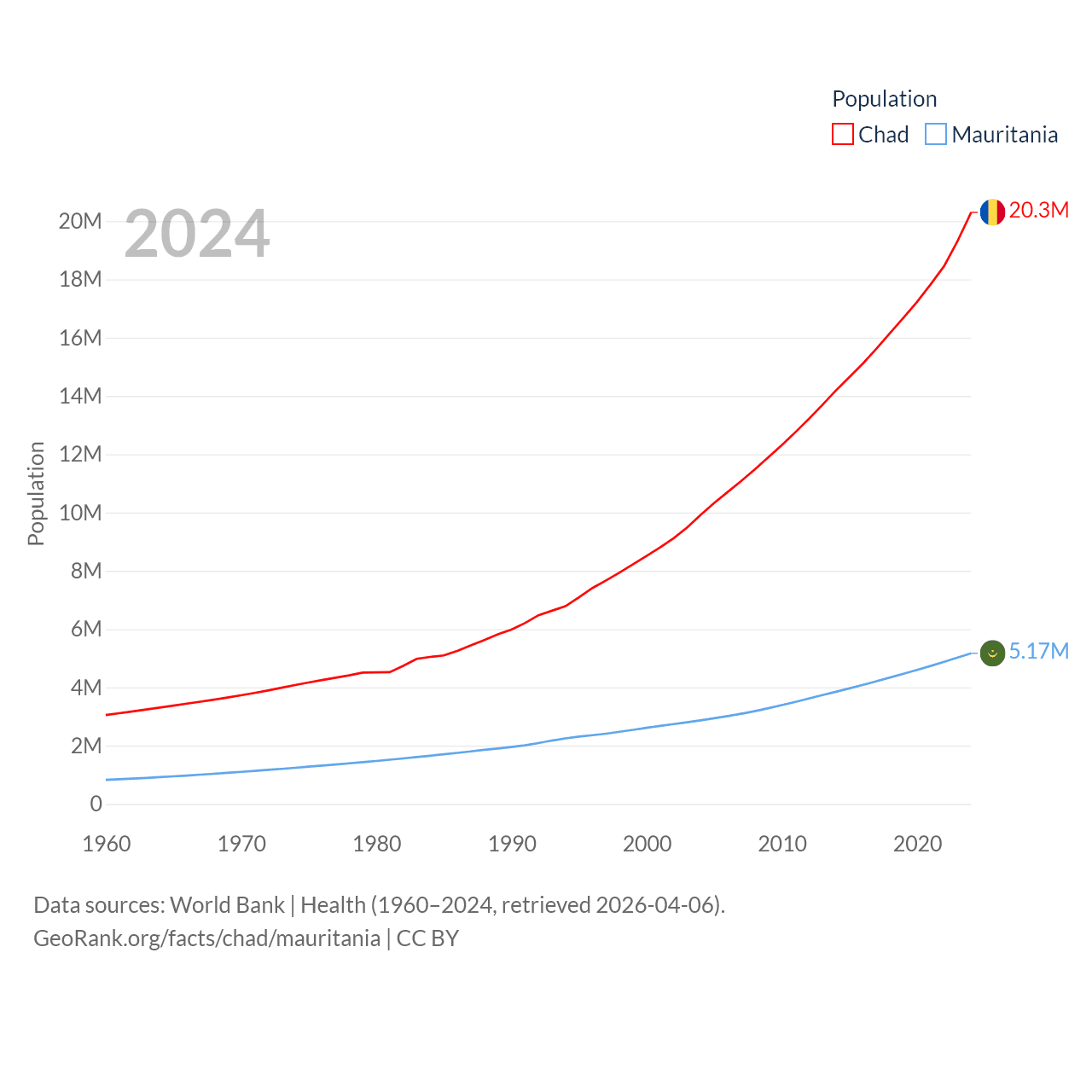 Chad has a population of 20.3M (ranked 65/197), compared with 5.17M in Mauritania (ranked 125/197). Chad's land area is 486,180 sq mi versus 397,955 sq mi for Mauritania (ranked 21st vs. 28th).