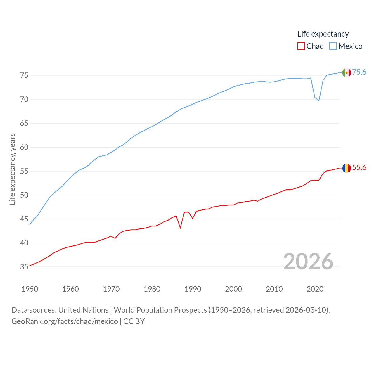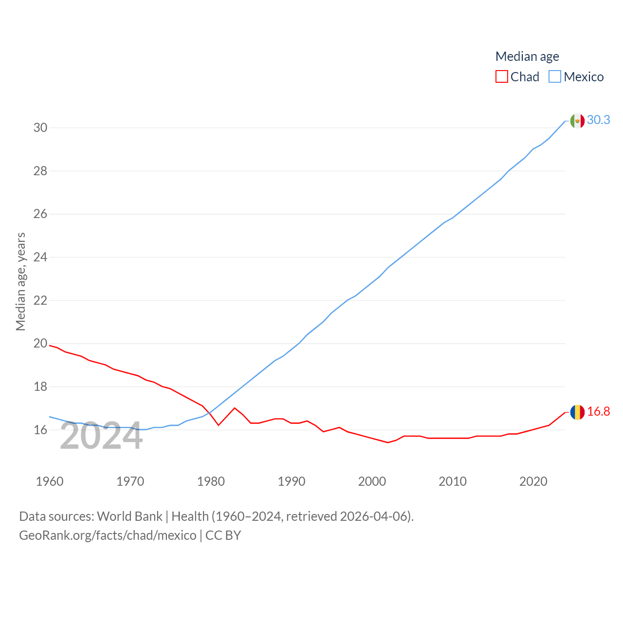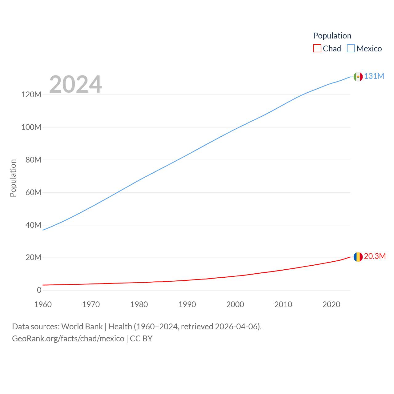 Chad has a population of 20.3M (ranked 65/197), compared with 131M in Mexico (ranked 11/197). Chad's land area is 486,180 sq mi versus 750,563 sq mi for Mexico (ranked 21st vs. 13th).
