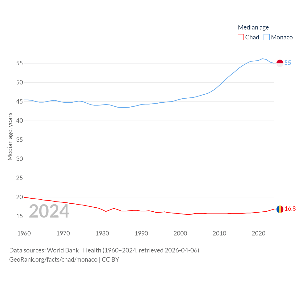 Chad has a population of 20.3M (ranked 65/197), compared with 38.6K in Monaco (ranked 191/197). Chad's land area is 486,180 sq mi versus 0.8 sq mi for Monaco (ranked 21st vs. 196th).