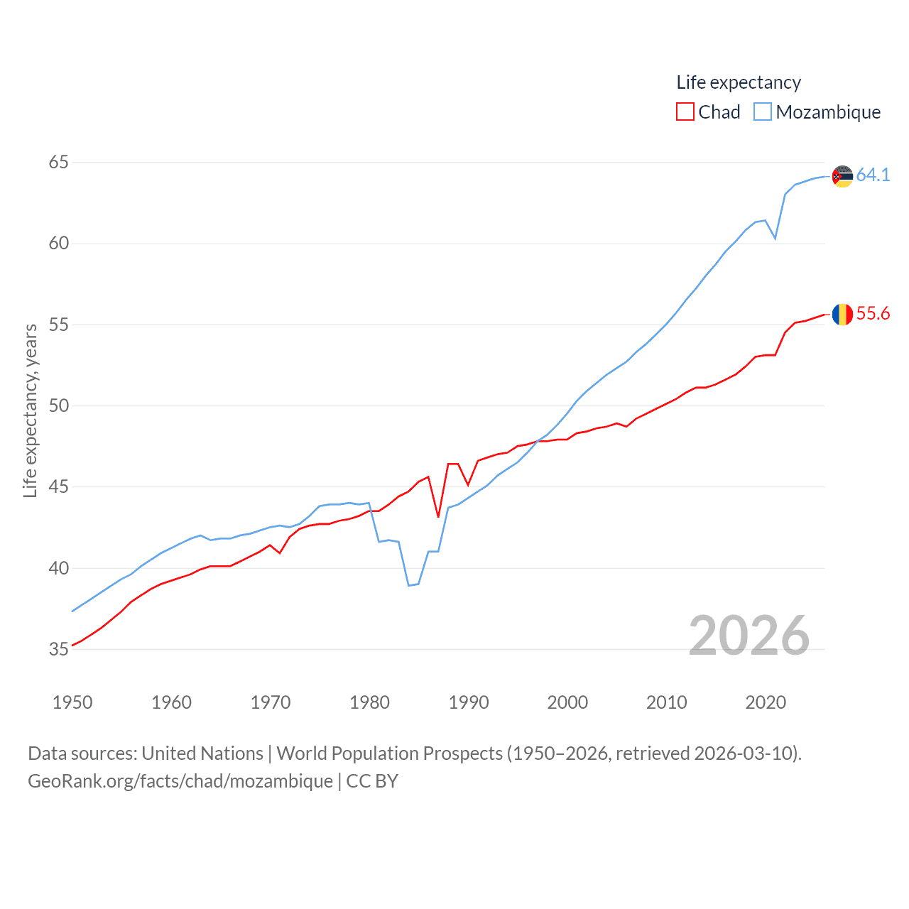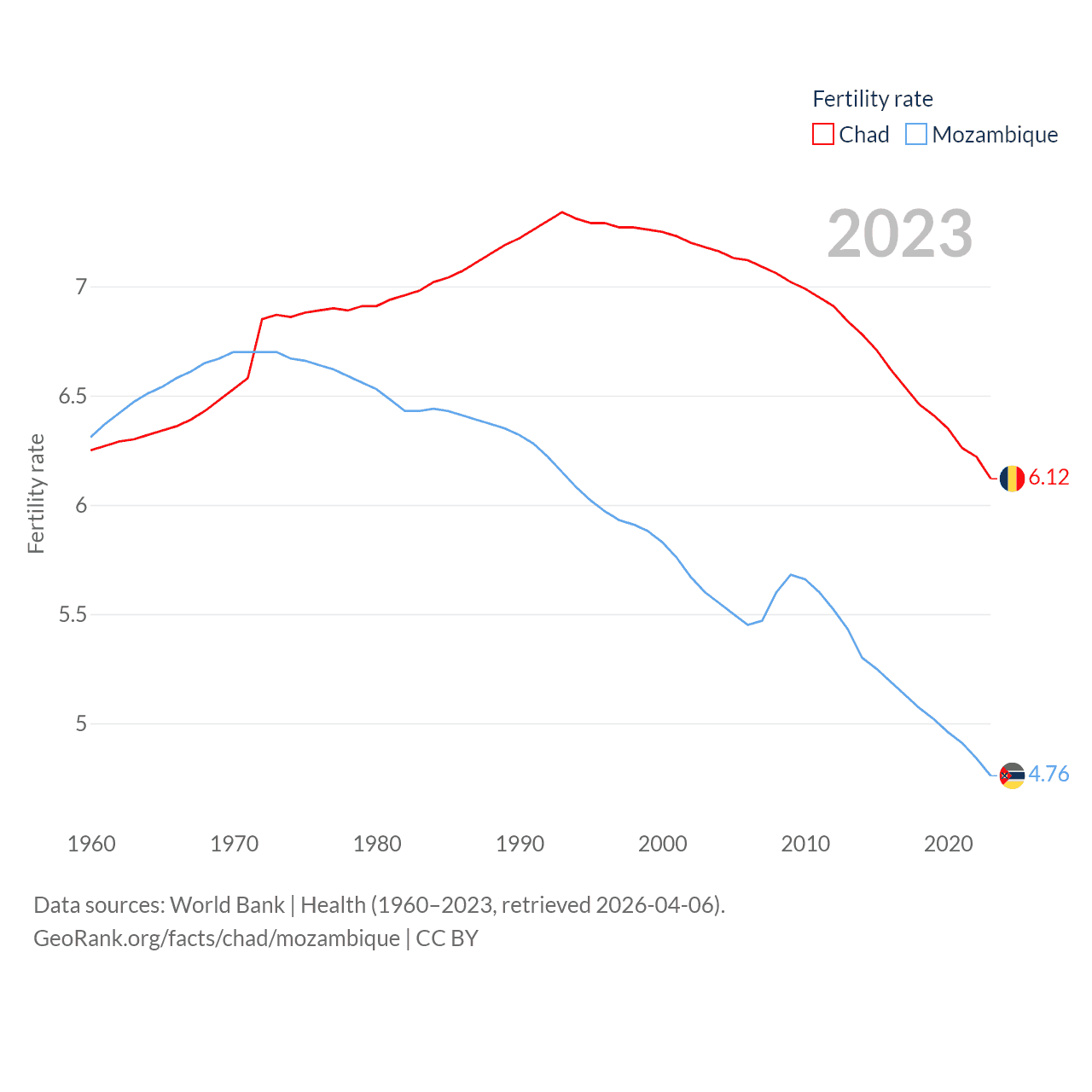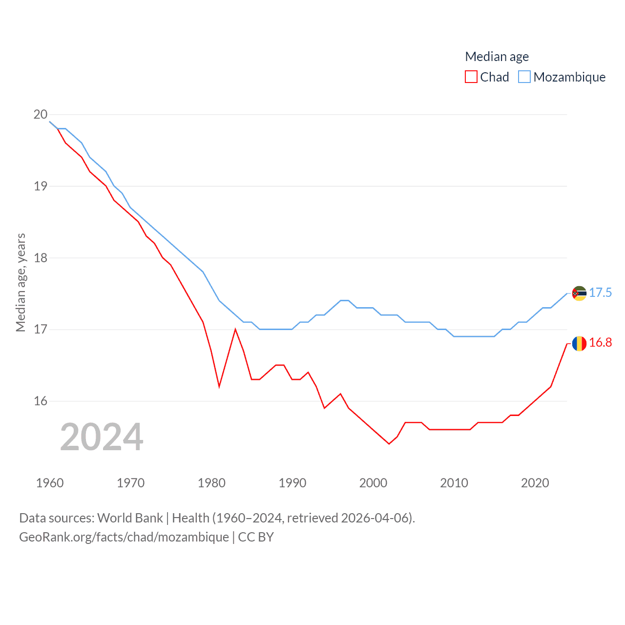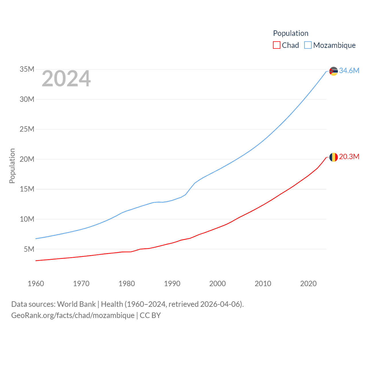 Chad has a population of 20.3M (ranked 65/197), compared with 34.6M in Mozambique (ranked 46/197). Chad's land area is 486,180 sq mi versus 303,623 sq mi for Mozambique (ranked 21st vs. 34th).