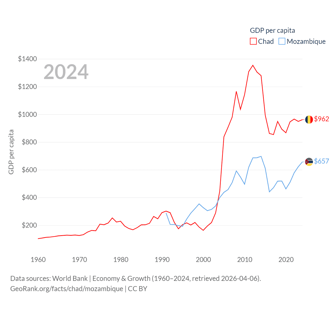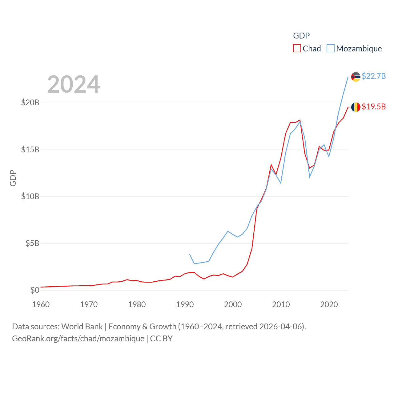 By GDP, Chad ranks 132/197 ($19.5B) and Mozambique ranks 123/197 ($22.7B). By GDP per capita, Chad ranks 182/197 ($962), while Mozambique ranks 189/197 ($657).